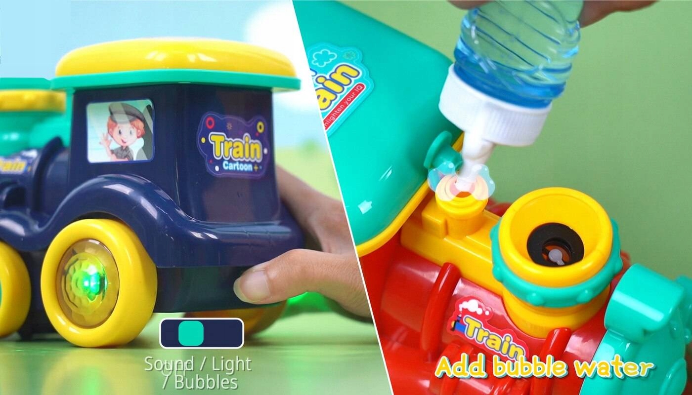 Локомотив, который высвобождает мыльные пузырьки, игра сияет и катается на интерактивной игрушке для детей, которая сочетает в себе несколько различных функций. что также позволяет играть в темноте Направления
