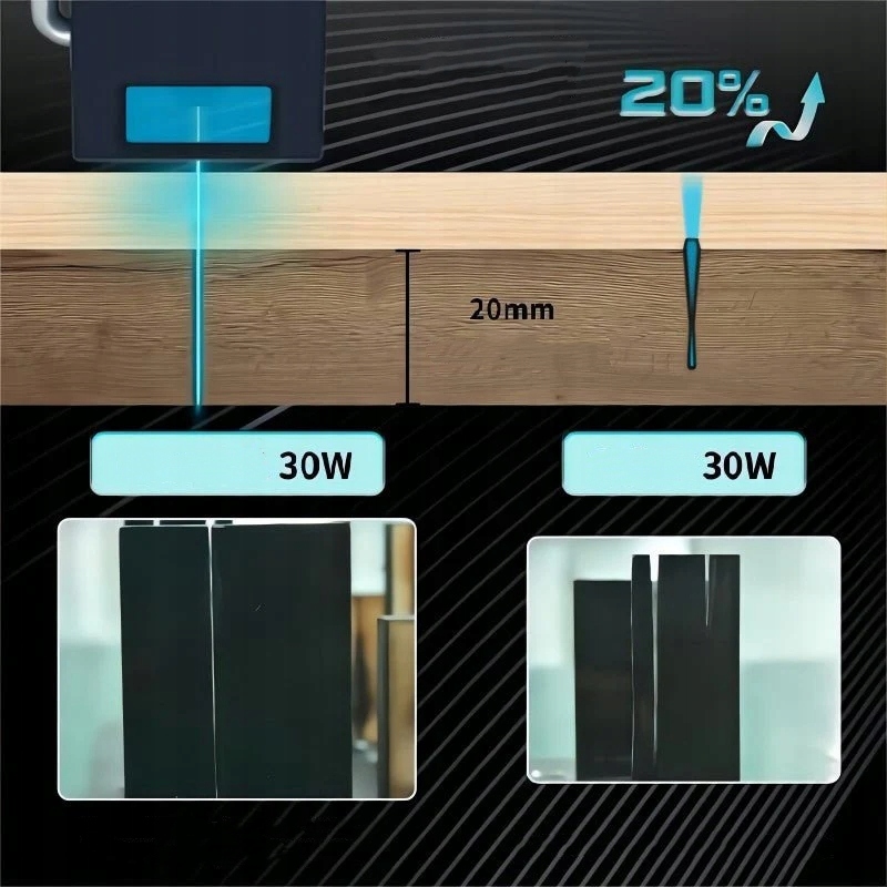 Остросфокусированный лазерный луч увеличивает эффективность резки на 20 %, позволяя резать древесину липы толщиной 25 мм и акрила толщиной 50 мм.