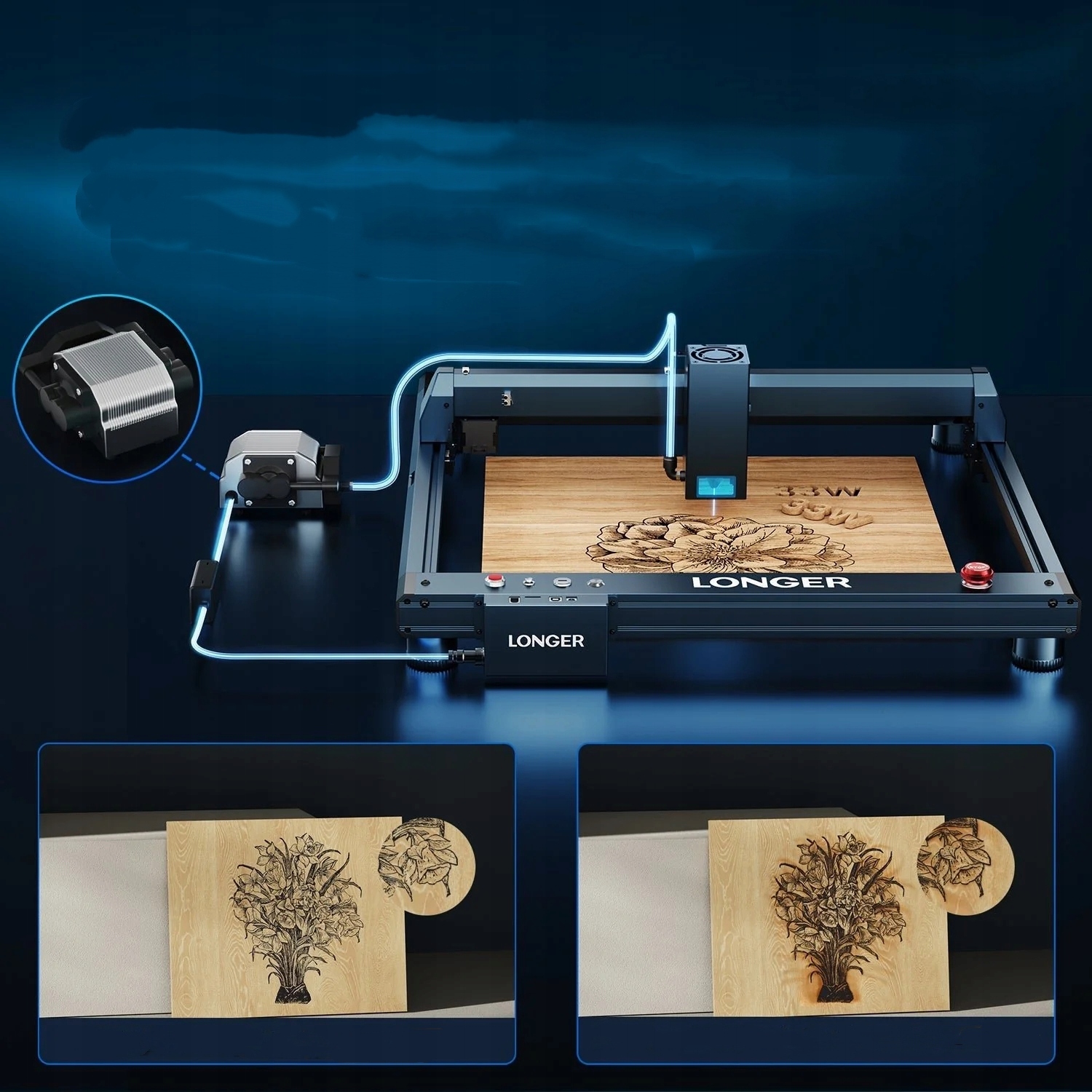 Лазерный гравировальный станок LONGER Laser B1 мощностью 30 Вт оснащен шестиядерным диодным лазером, который может резать дерево толщиной 25 мм, черный акрил толщиной 50 мм и даже нержавеющую сталь толщиной 0,1 мм. Длинное фокусное расстояние 50 мм обеспечивает высокосфокусированный луч, что гарантирует точную и безошибочную гравировку. Интеллектуальная пневматическая система поддержки еще больше повышает качество гравировки. Кроме того, вы можете окислить металлические поверхности до более чем 300 различных цветов, обеспечивая яркие впечатления от гравировки.