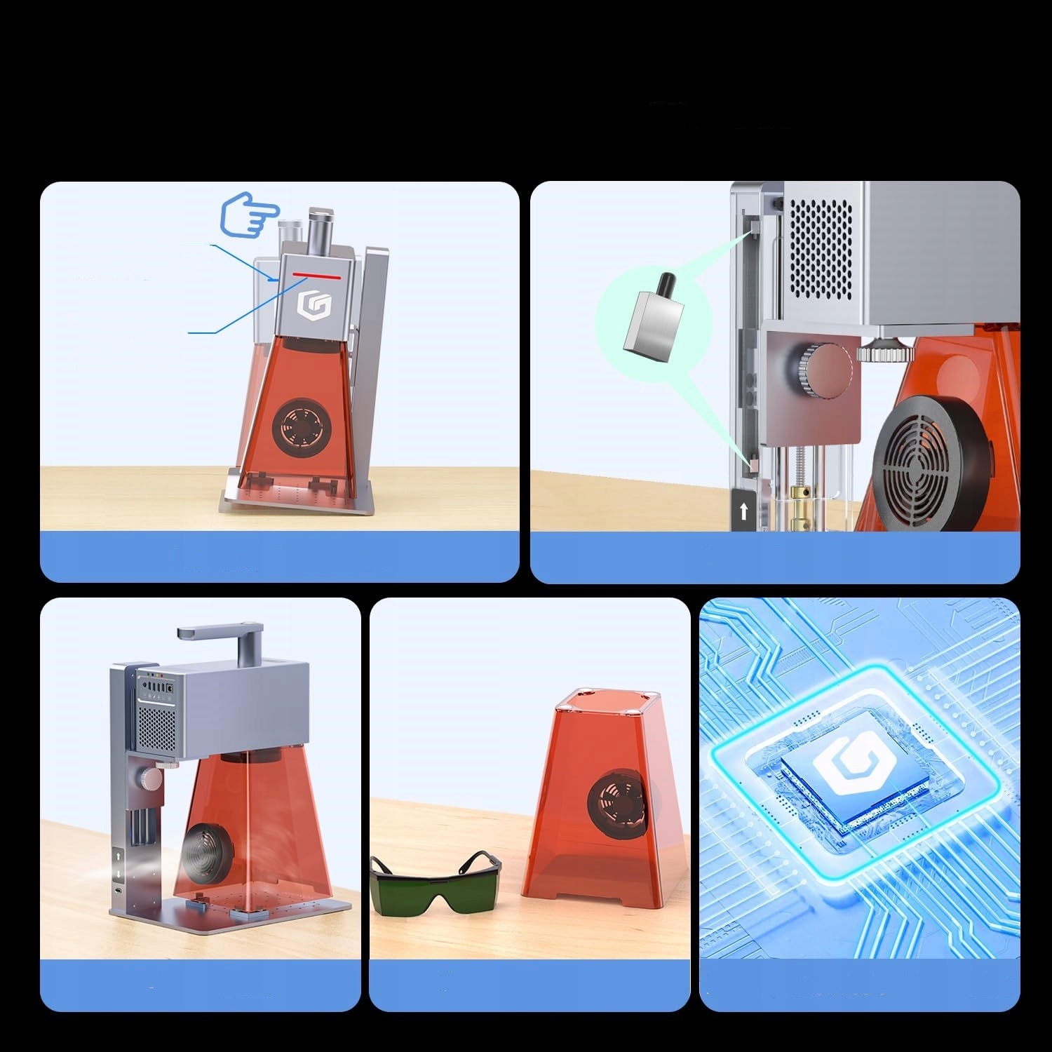 Лазерный гравер Nano Pro оснащен защитным чехлом и защитными очками, которые эффективно защищают ваши глаза. Функция защиты от движения автоматически отключает устройство, если во время движения происходит необычно сильный удар, обеспечивая безопасность. Функция термозащиты автоматически отключает устройство, если в зоне гравировки обнаружено пламя или перегрев.