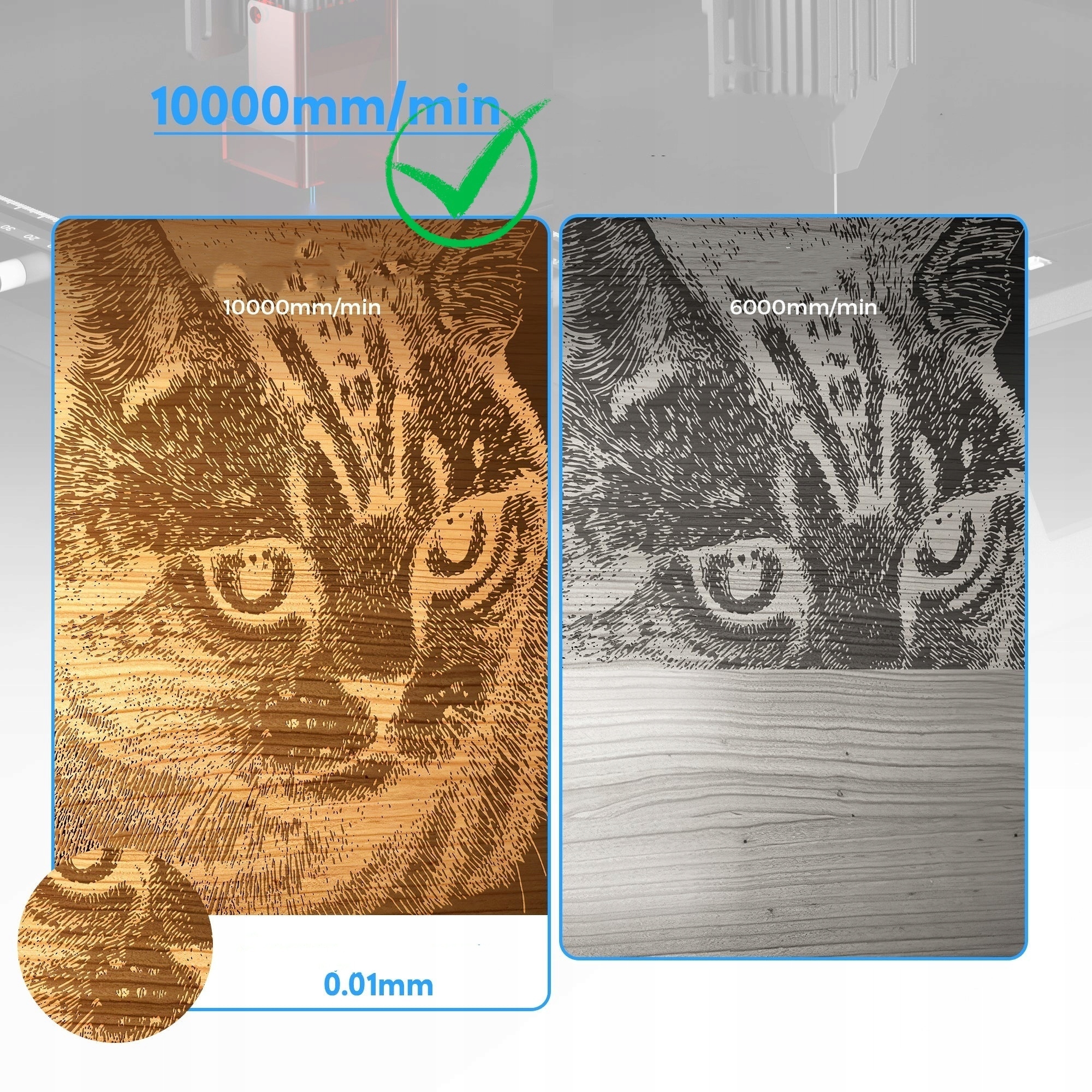 Ray5 использует новейшую технологию сжатого лазера для создания ультратонкого лазерного пятна, которое в два раза тоньше, чем у обычных лазеров, что делает резку и гравировку Ray5 более точными и последовательными, с более тонкими линиями, более четкими текстурами и более нежной и красивой графикой.