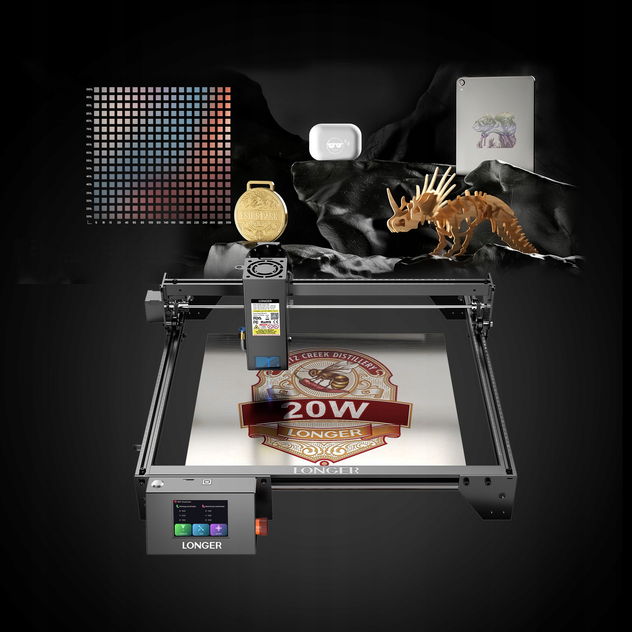 Гравировальный станок LONGER RAY5 мощностью 20 Вт может гравировать со скоростью до 10 000 мм/мин. Почти в 3 раза быстрее, чем обычные гравировальные станки. Экономьте драгоценное время, быстро создавая гравированные изделия.