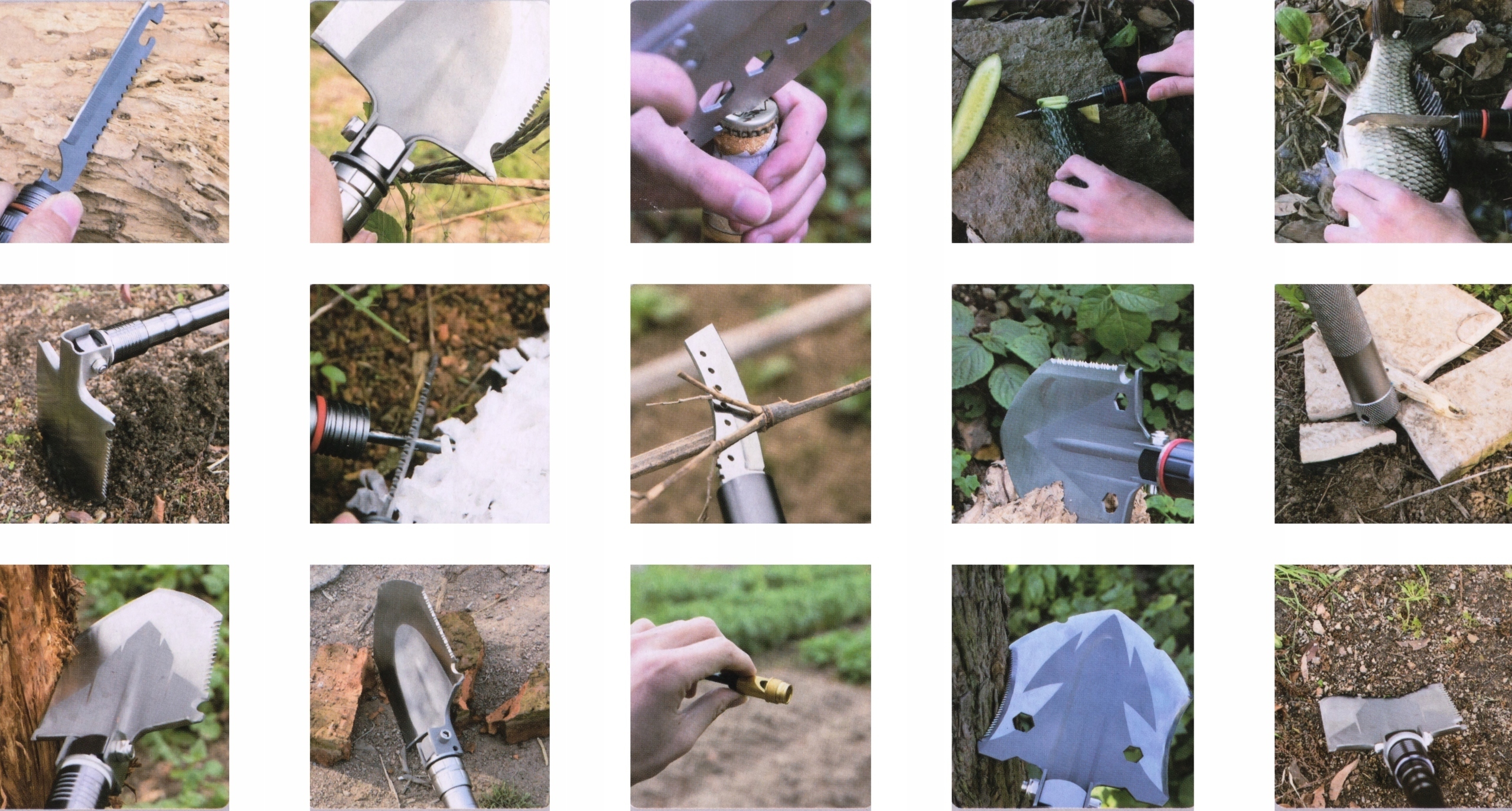 Головка фиксируется под углом от 0° до 180° и может использоваться как крюк, мотыга или лопата.