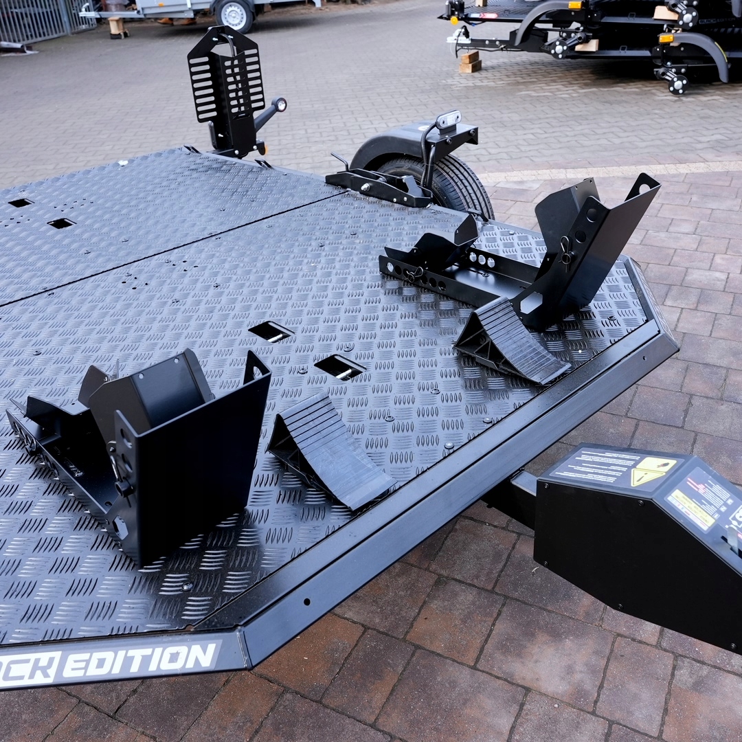 Специальный прицеп с одной осью для транспортировки мотоциклов с DMC до 750 кг является идеальным средством для транспортировки двух шипов. Его конструкция основана на стабильной раме, дополнительно поддерживаемой поперечным подкреплением, в которое отправляется натяжка. Кроме того, он окрашен в черный цвет. Благодаря тому, что из двух движущихся частей (в полмеры) мы можем легко сложить его пополам, что облегчит его хранилище в то время, когда оно не будет использоваться. Таким образом, в гараже займет гораздо меньше места