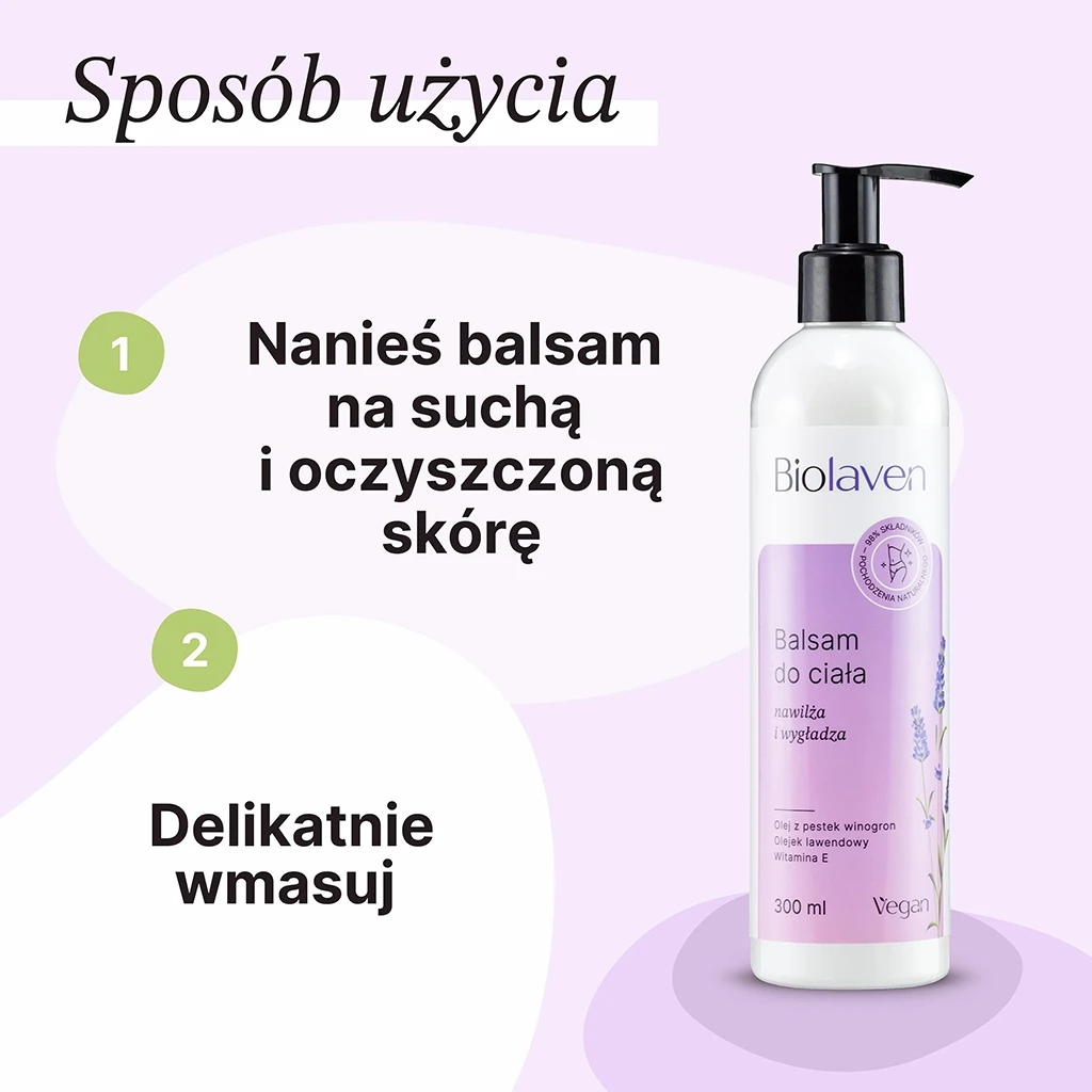 Бальзам содержит натуральное эфирное масло лаванды, которое снимает раздражения кожи, успокаивает, успокаивает и расслабляет. Его уникальный лавандово-виноградный аромат гарантирует момент передышки во время ежедневного ухода. Приятный аромат надолго остается на коже.