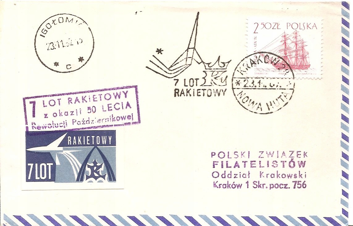LOT RAKIETOWY -koperta -nalepka 7 LOT RAKIETOWY -stempel Kraków Nowa Huta