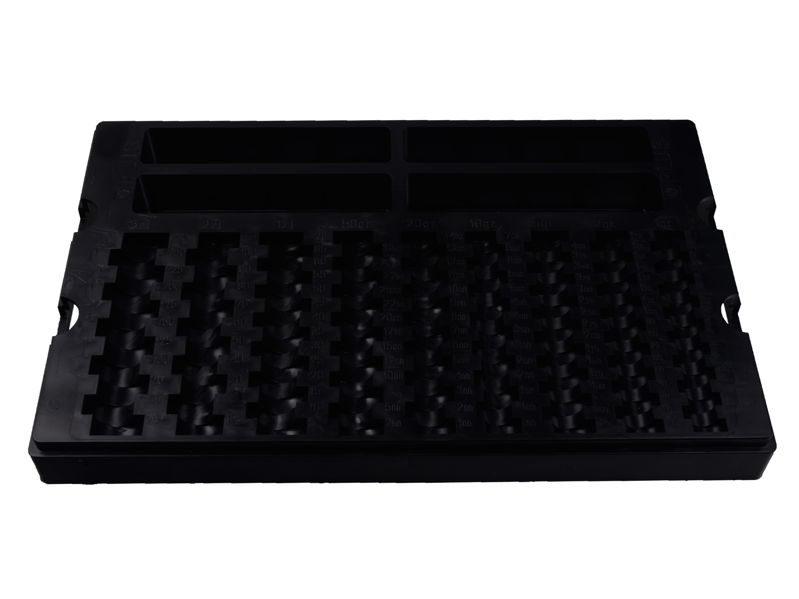 Лоток для монет и банкнот из качественного пластика черного или серого цвета.