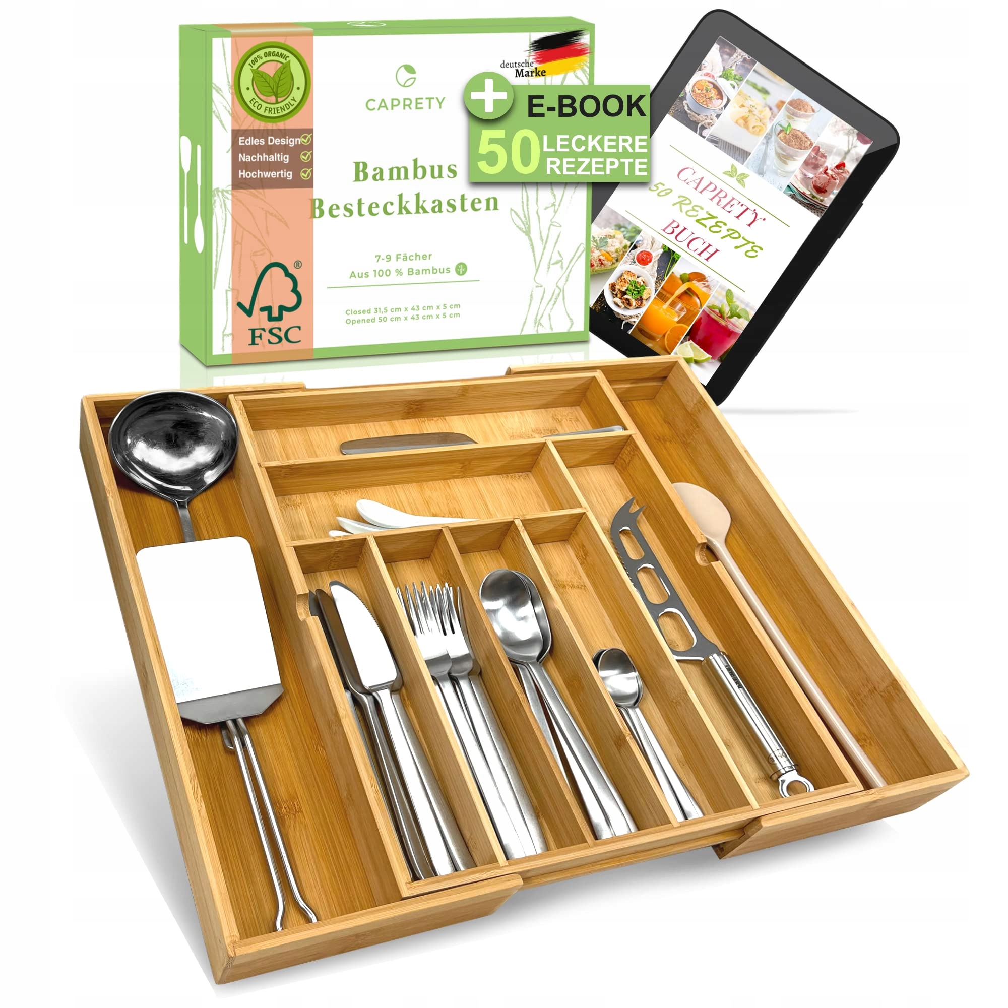 ✅ Регулируемый размер - бамбуковый ящик для столовых приборов капрета чрезвычайно легко вытащить и идеально подходит для любого кухонного ящика. Выберите между 7 (43x31,5x5 см) до 9 (43x50x5 см) с перегородками!