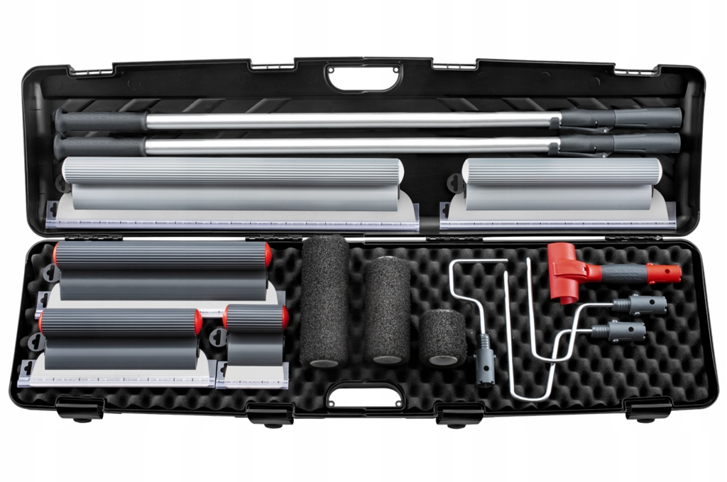 - В комплект входят 5 самых необходимых шпателей, 3 ролика и телескопические удлинители.