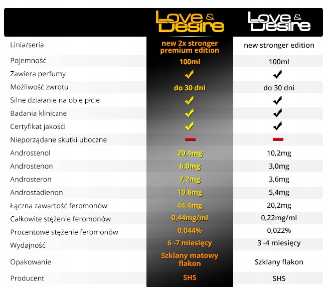 Разница в действии между обычной серией Love & Desire и серией PREMIUM EDITION состоит в том, что в премиум-издании концентрация каждого феромона в два раза выше. Благодаря этому вы получаете в два раза больше после одного использования. Ограниченное издание предназначено для людей, которые ищут еще больше впечатлений и испытаний и любят, когда их боготворят. Кроме того, если вы использовали Love & Desire раньше и их эффект показался вам слишком легким, желаемая цель приблизилась, но не так сильно, как вы ожидали - сделайте вторую попытку, на этот раз с Love & DesirePREMIUM EDITION, где успех гарантирован!