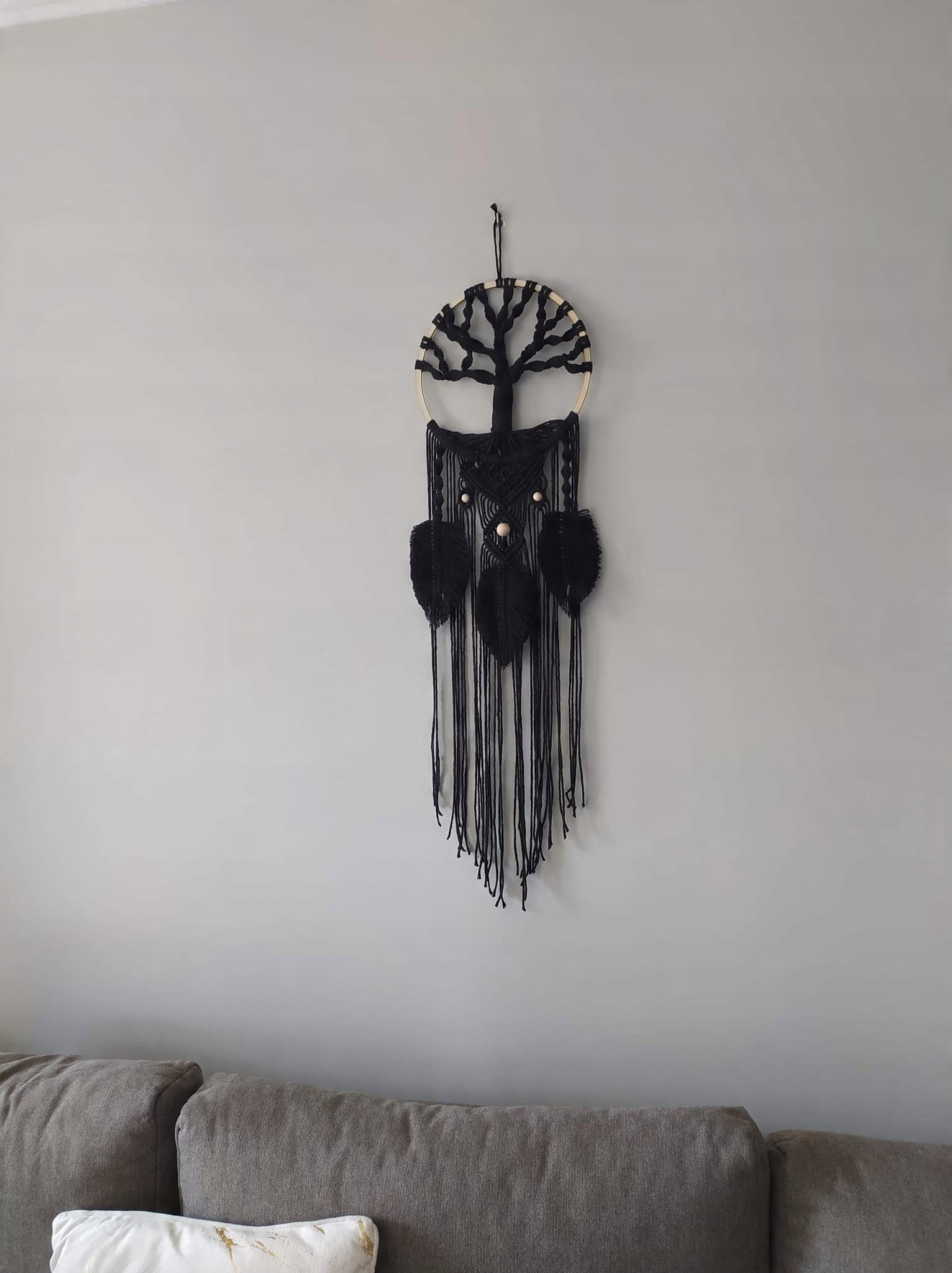 Здравствуйте, я делаю индивидуальный ловец снов - дерево счастья. Макраме изготовлено вручную из черной хлопковой нити (оттенок нити может отличаться в зависимости от партии). Этот кулон украсит и согреет любой домашний интерьер и может стать красивым, оригинальным подарком на любой праздник. Уловитель выполнен на ободе 28 см, длиной примерно 90 см.