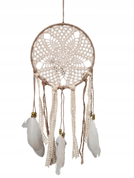 Очень эффектный и изящный ловец снов. Круг диаметром 21 см, обмотанный джутовой нитью натурального цвета. Внутри круга находится хлопковый элемент, связанный крючком. К нижней части колеса прикреплены белые натуральные перья, дополнительно украшенные натуральными деревянными бусинами, и хлопковое кружево.