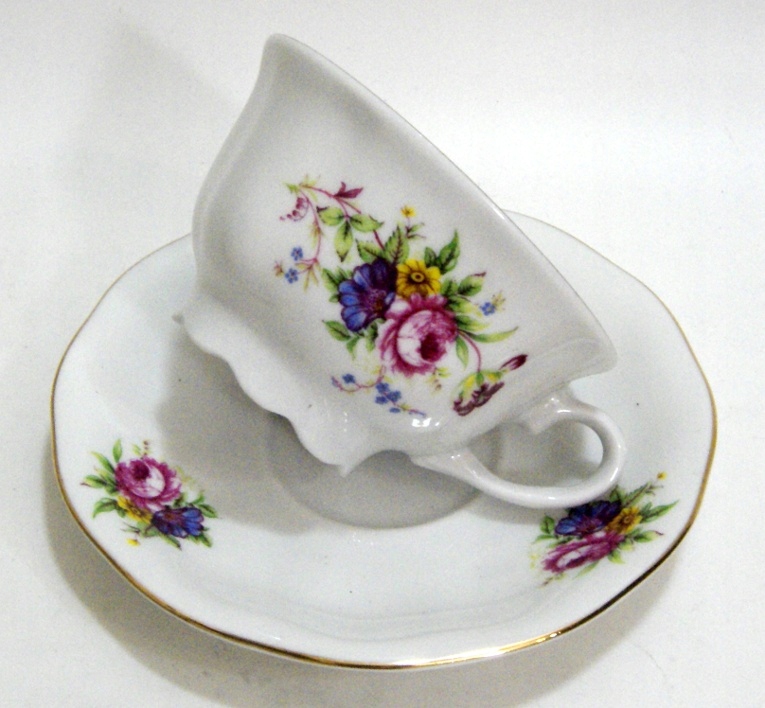 Красивая, старинная чашка из белого фарфора, украшенная цветами.