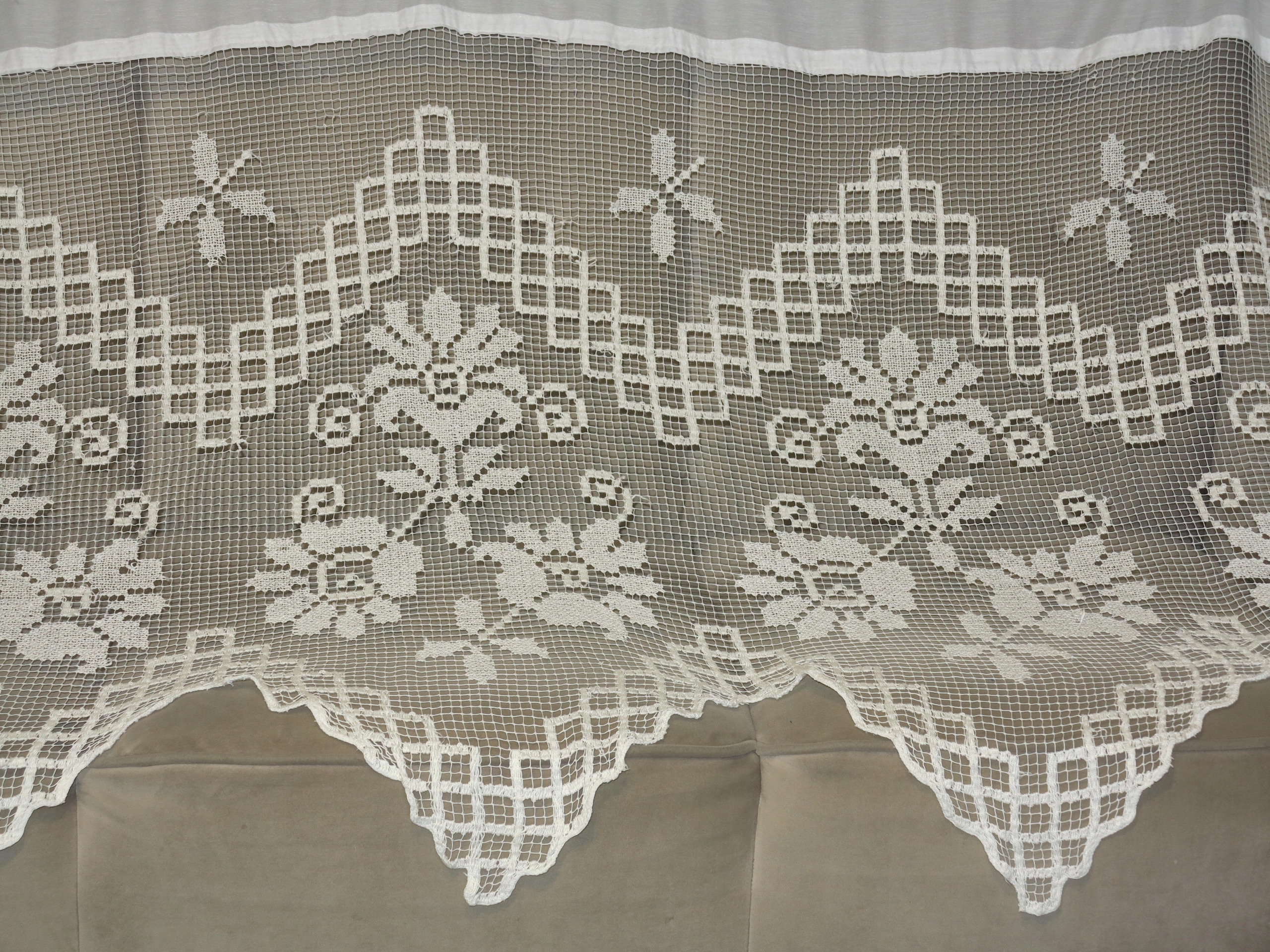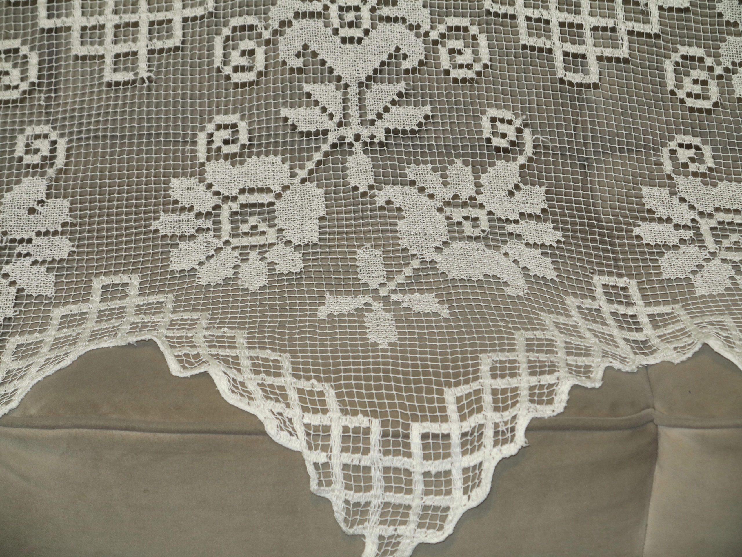 МИЛЫЙ ВЕКОВОЙ МИСЛИНОВЫЙ ШТОР С ДЕКОРАТИВНОЙ БУЛАВКОЙ РУЧНОЙ РАБОТЫ С БОЛЬШИМИ ЗУБЦАМИ ВНИЗУ