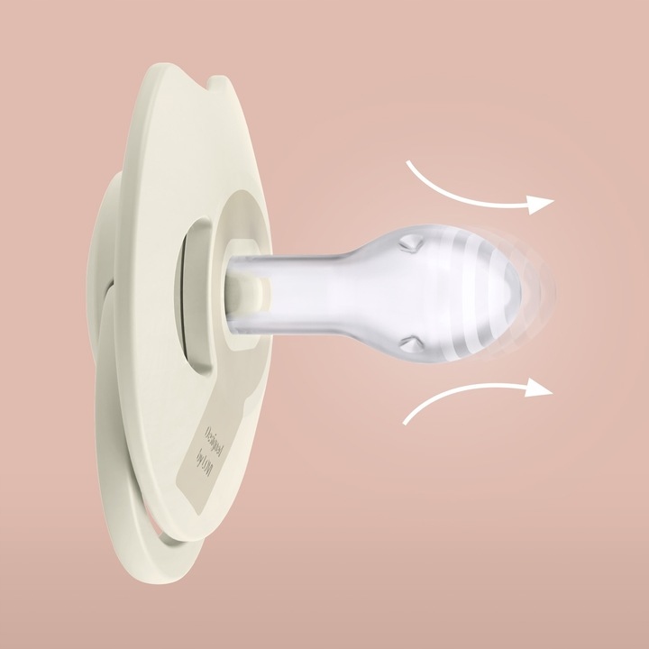 Динамическая соска, благодаря уникальной силиконовой структуре различной толщины, растягивается и сжимается в соответствии с ритмом сосания ребенка. Благодаря этому он защищает свой всасывающий рефлекс и не оказывает неблагоприятного влияния на грудное вскармливание. Форма ластика симметрична и вдохновлена формой соска, чтобы обеспечить знакомые чувства для ребенка. Диск по снижению сочинения имеет специальную часть, чтобы облегчить дыхание в носу и глотать слюну, как с грудью. Профилированный щит прилипает к коже ребенка как можно меньше, что облегчает поток свободного воздуха и снижает риск раздражения кожи.