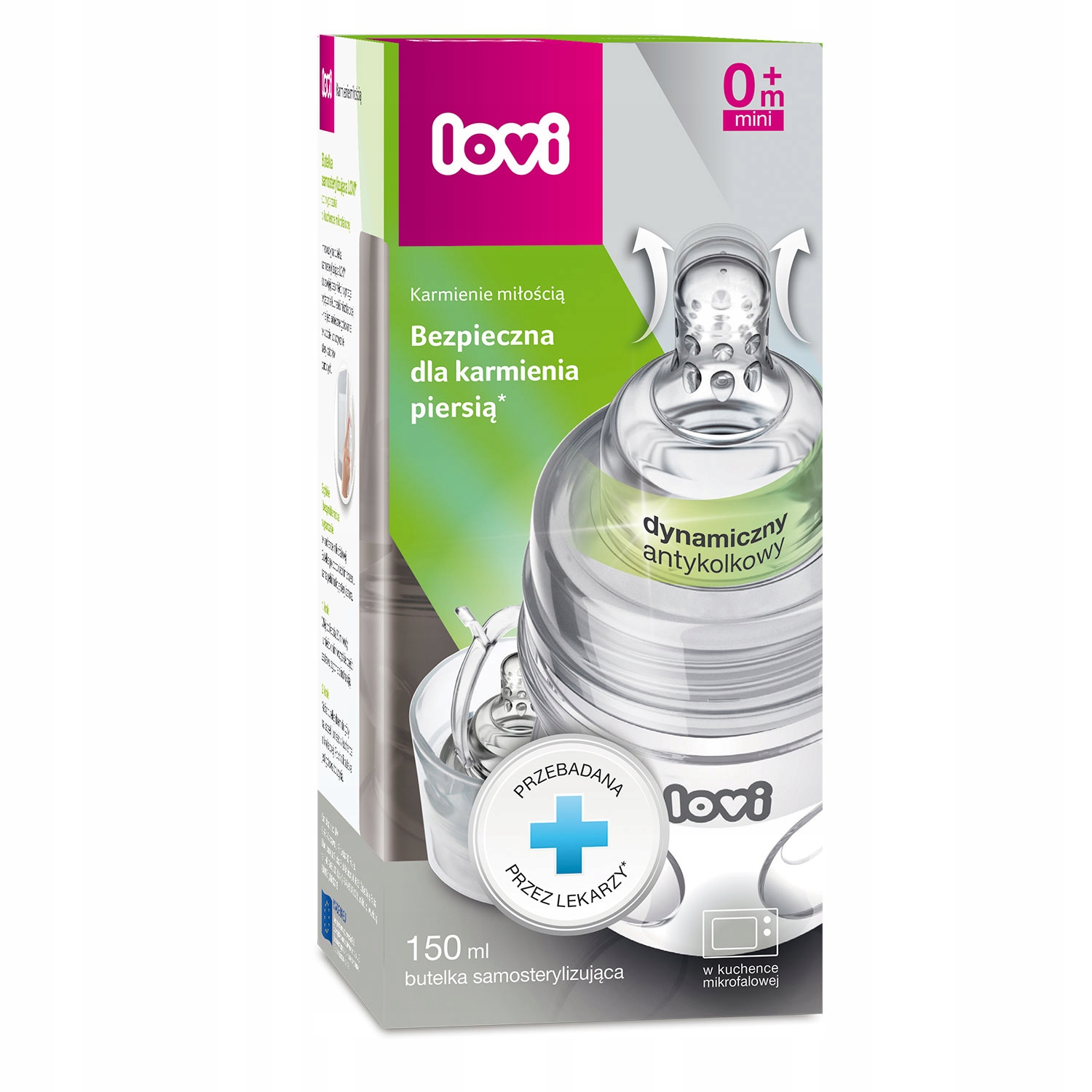 Бутылочка LOVI безопасна для ребенка, находящегося на грудном вскармливании, поскольку не нарушает сосательный рефлекс. Он имеет специально разработанную крышку, которая позволяет стерилизовать бутылочку и все ее компоненты всего за 90 секунд с помощью микроволновой печи. Просто налейте в колпачок необходимое количество воды, вставьте колпачок и соску с прикрепленной ручкой, соедините ее с бутылочкой (щелкнув) и поместите в правильно настроенную микроволновую печь. Через некоторое время бутылочка готова к кормлению.