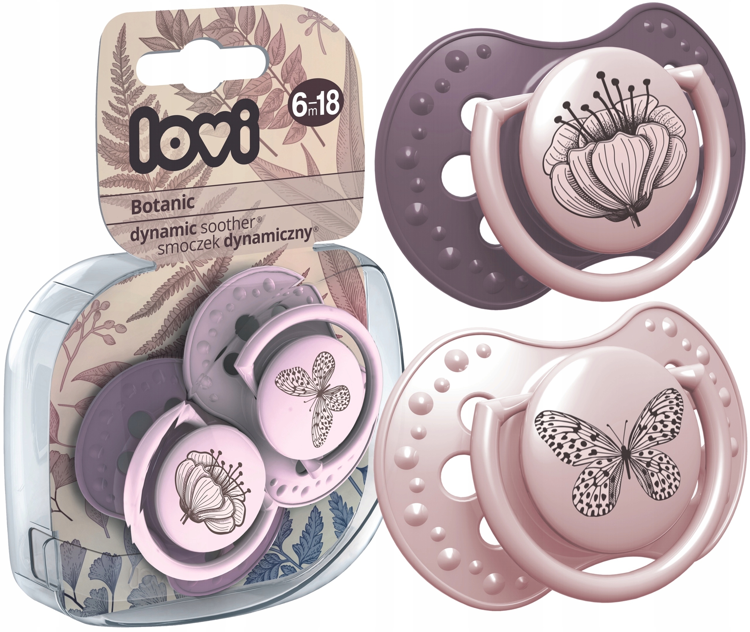 Динамические пустышки LOVI были разработаны в результате исследований с участием врачей и неврологов. Они имеют симметричную форму, вдохновленную формой соска. Специальное решение, предполагающее использование неоднородного слоя силикона, позволяет сосать в индивидуальном ритме.