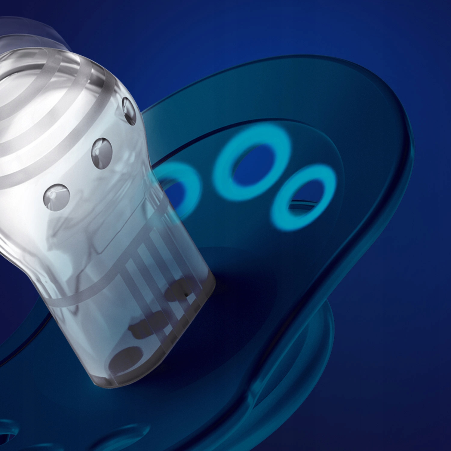 Она имеет уникальную структуру, изготовленную из гетерогенный силикон и симметричная форма, напоминающая сосцевидный отросток соска. Она не нарушает сосательный рефлекс и естественное развитие речи и прикуса*.
