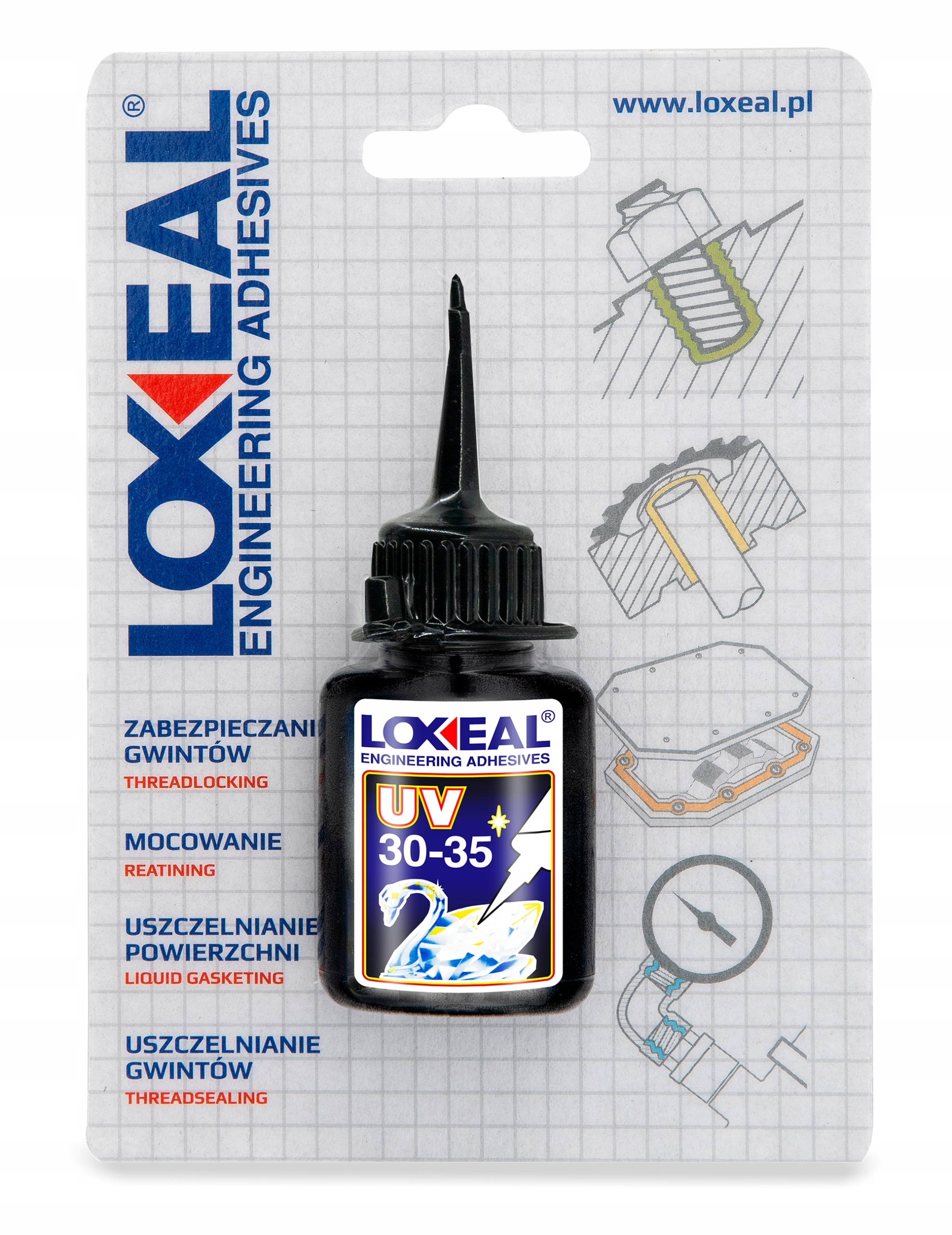 LOXEAL UV 30-35 — однокомпонентный акриловый клей высокой вязкости, полимеризующийся под воздействием УФ-лучей. Данный клей предназначен для использования во влажной среде. Предназначен для склеивания стекла со стеклом или стекла с металлом, чаще всего применяется для приклеивания напольных весов, петель и ручек душевых дверей, металлических профилей, в т.ч. алюминий, к стеклу, изготовление дорожных знаков, для приклеивания витрин, террариумов и холодильных прилавков. Поверхность сустава может подвергаться воздействию УФ-лучей с помощью излучателя (УФ-лампы) или солнечного света. Клеи, отверждаемые УФ-излучением, отличаются: высокой прочностью, способностью заполнять зазоры, очень коротким временем отверждения (несколько секунд для достижения ручной прочности), очень хорошей устойчивостью к средам, легким дозированием, в том числе в автоматических системах нанесения, благодаря отсутствию смешивания. . Скорость отверждения клеев зависит от интенсивности и длины волны УФ-излучения, а также расстояния от источника излучения.