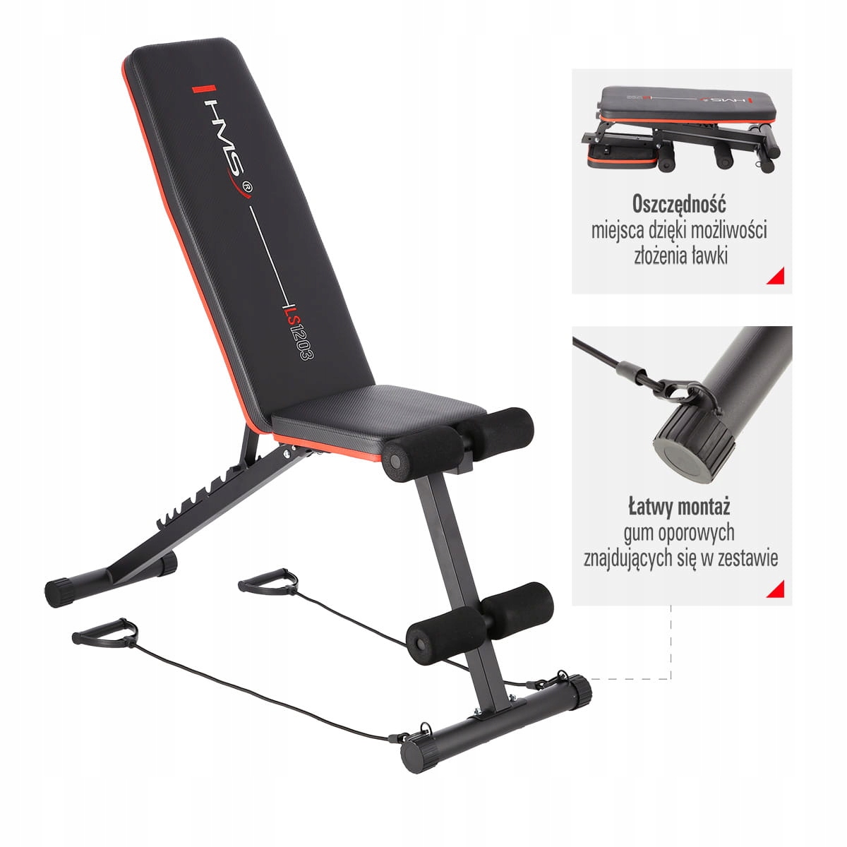 В комплект скамьи LS1203 HMS входят дополнительные эспандеры для рук, которые крепятся к передней ножке скамьи. Мы можем использовать эспандеры во время разминки или во время тренировки, установив спинку под соответствующим углом.