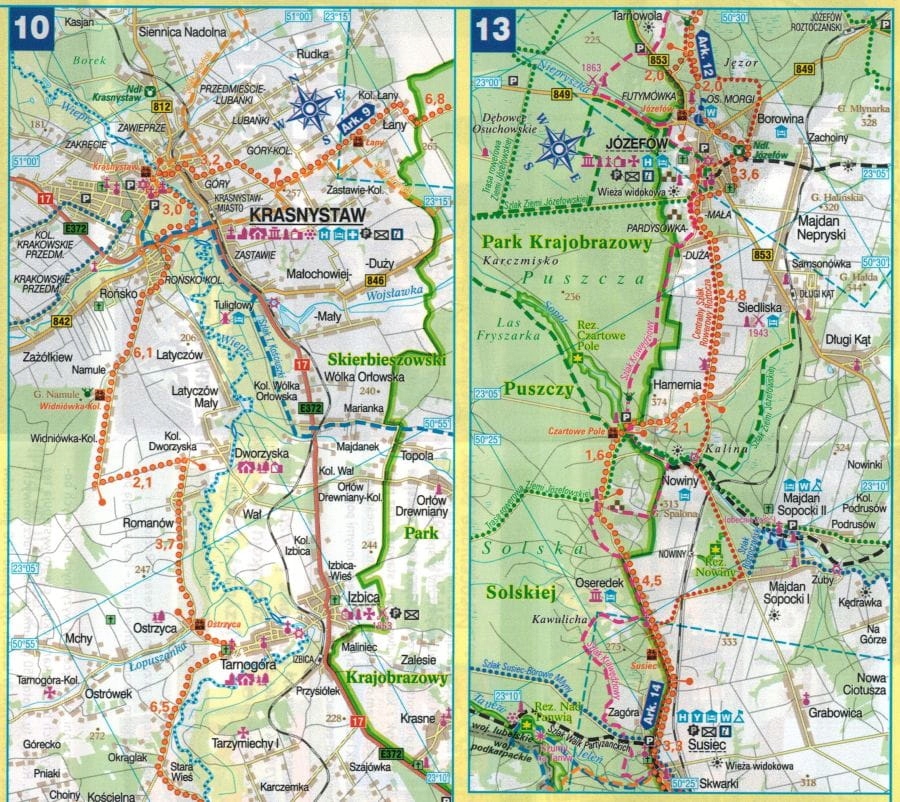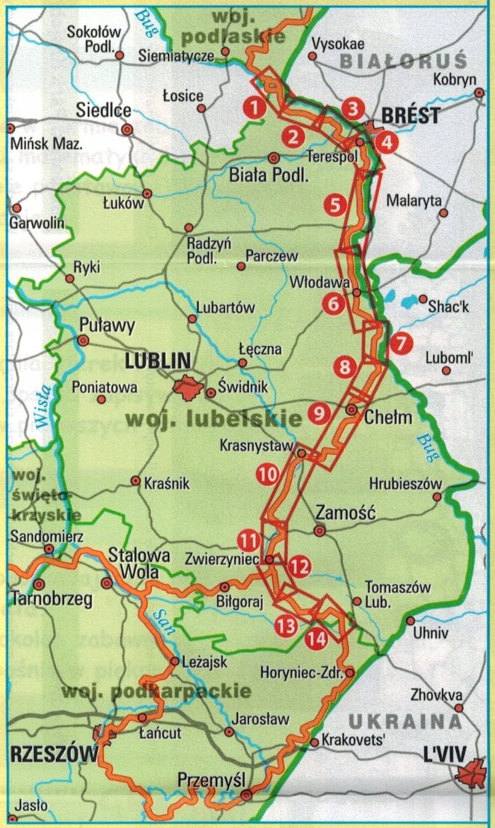 Водонепроницаемая и устойчивая к разрыву складная туристическая карта велосипедной тропы Green Velo Люблинского воеводства в масштабе 1:100 000.