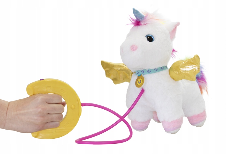 Хватайте поводок и отправляйтесь на прогулку с единорогом, он будет с вами повсюду! У Лаки очень устойчивые копыта со специальными шариками, которые удерживают его в вертикальном положении, даже когда он следует за детьми младшего возраста. Поводок имеет встроенный насос, который при нажатии поднимает вверх его золотые крылья и хвост, а также звуковой чип, активирующийся при движении или встроенную в поводок кнопку.
