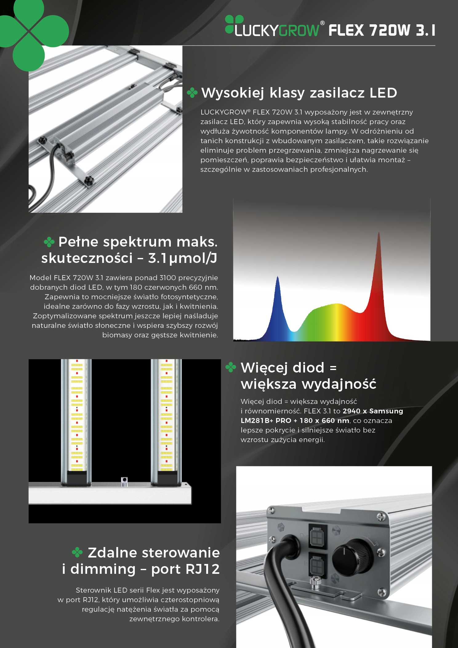 LuckyGrow Flex 720W 3.1 В наборе с внешним светодиодным источником питания - это усовершенствованное светодиодное устройство, созданное специально для растений. Благодаря использованию современной технологии и оптимизированному призраку фотосинтетически активного (номинального) света, устройство гарантирует эффективность и эффективность на каждом этапе роста растений. 180 x Hongli SMD3535 660 нм