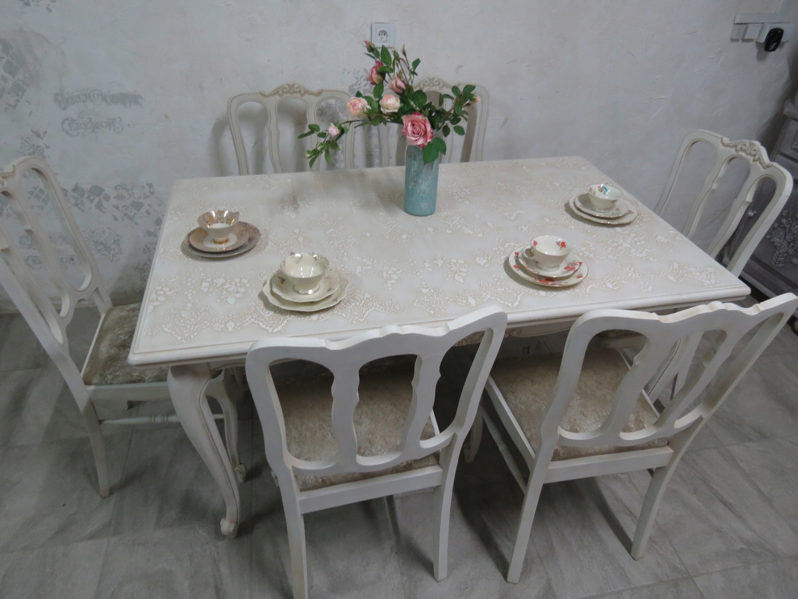 Комплект идеален для вечеринок, длительных застолий, торжеств.Раздвижной стол и 6 стульев в стиле Людвик.Окрашены в античный белый цвет, патинированы в бежевый цвет, состарены, потерты, тонированы, в результате чего получен светло-бежевый, растушеванный цвет. На столешнице я сделала кружево из рельефов.Beautiful представляет собой 6 стульев в комплекте, материал обивки красивого позолоченного бежевого цвета, новое наполнение сиденья, совершенно отличное от оригинала, мягкое и очень удобное для длительных застолий.