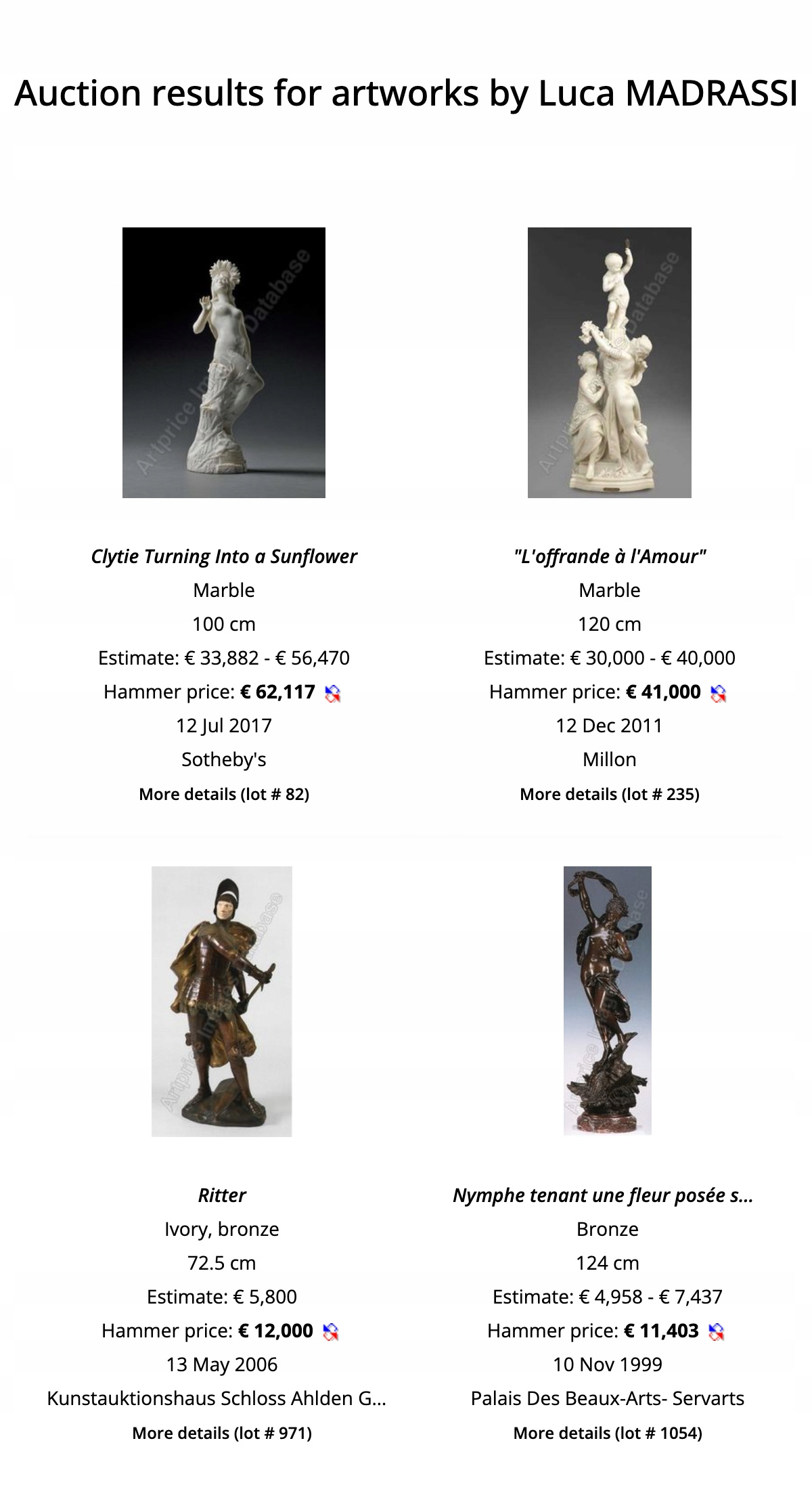 Старинные работы Луки Мадрасси высоко ценятся на мировом и европейском арт-рынке — его самая дорогая мраморная скульптура была продана за более чем 66 000 евро (Китай) и 62 117 евро ( Англия), а самые дорогие бронзовые скульптуры были проданы за более чем 18 000 евро (Франция) и 12 000 евро (Германия). Примеры аукционных котировок представлены в таблице ниже.