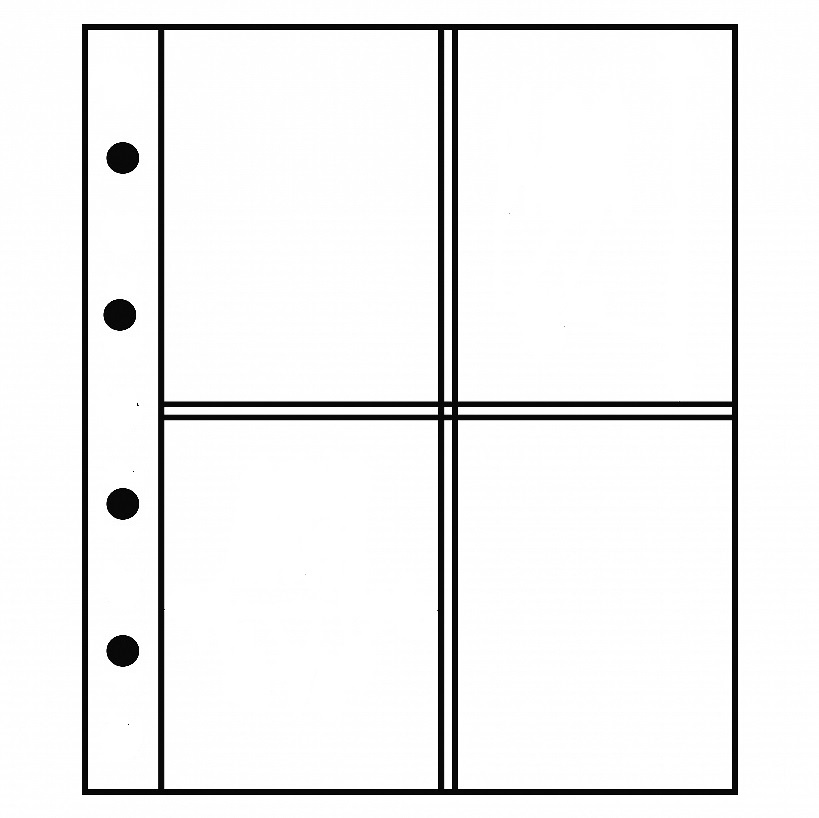 4CT-страница от профессиональной компании Lukos. Карта 4 КТ (прозрачная) позволяет рассмотреть объект с обеих сторон. Рекомендуется для хранения, например, банкнот, кассового аппарата и т. д. Страница разделена на 4 части.