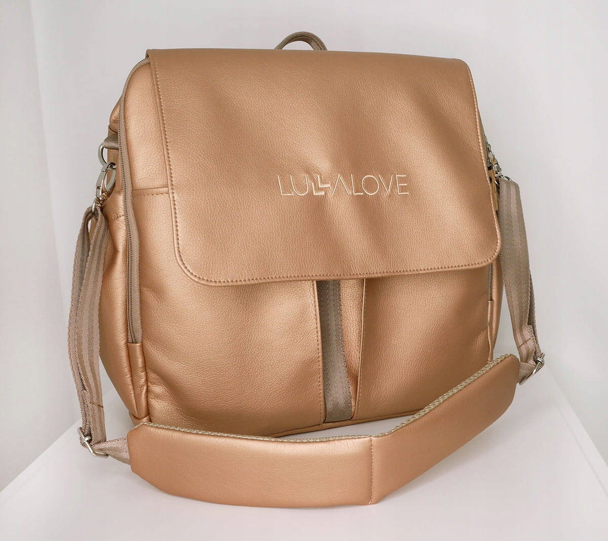 LULLALOVE TORBA DO WÓZKA PLECAK ORGANIZER DLA MAMY NA SPACERY ZŁOTY BEŻ