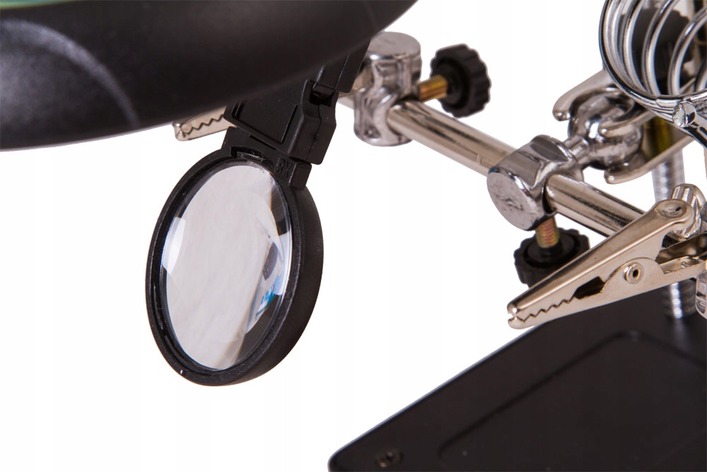 Третья рука поможет вам работать с платами и 3D-моделями, поскольку она прочно удерживает объект в нужном месте и позволяет выполнять точные действия в течение более длительного времени. Лупа также оснащена специальным держателем для паяльника (при необходимости можно снять).