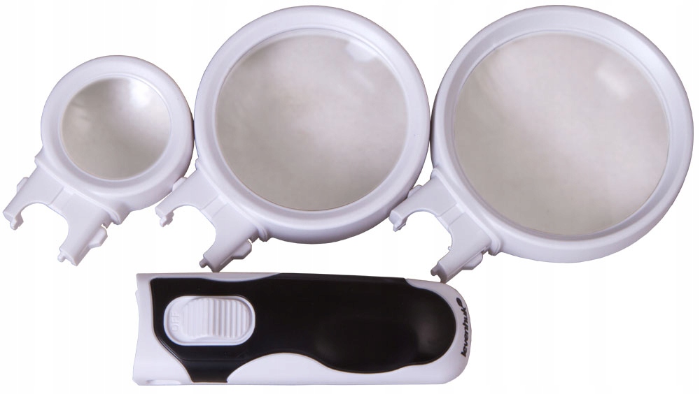 Модели с тремя сменными линзами разной степени увеличения и разного диаметра крепятся в эргономичной ручке с простой застежкой. Линза с большим увеличением используется для рассмотрения мелких предметов, а линза с низким увеличением – для чтения. Светодиодное освещение установлено в держателе. Равномерно освещает всю рабочую поверхность под объективом.