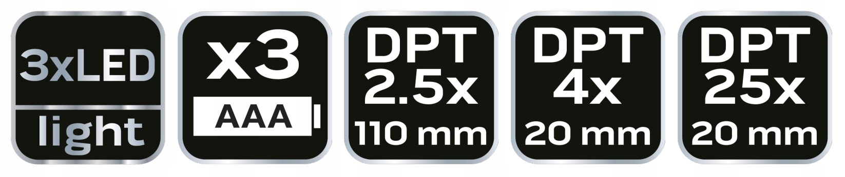Большой диаметр 110 мм обеспечит широкий угол обзора, а три линзы с разным изображением увеличение значительно облегчит работу или чтение.
