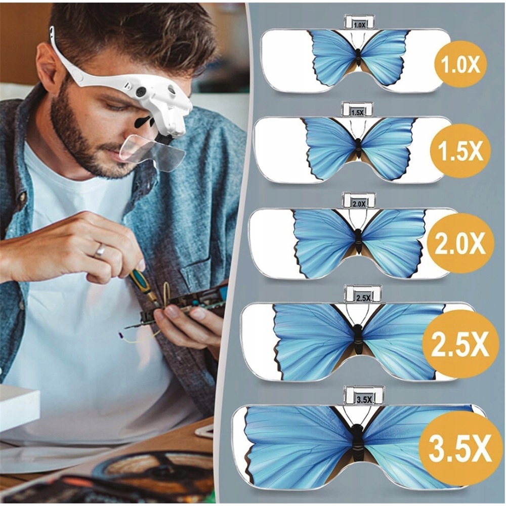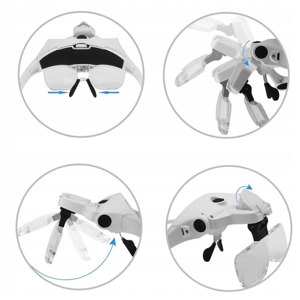 Наголовная лупа со светодиодной подсветкой, 5 линз, 1x 15x, 2x 25x 35x, регулировка угла и расстояния, USB