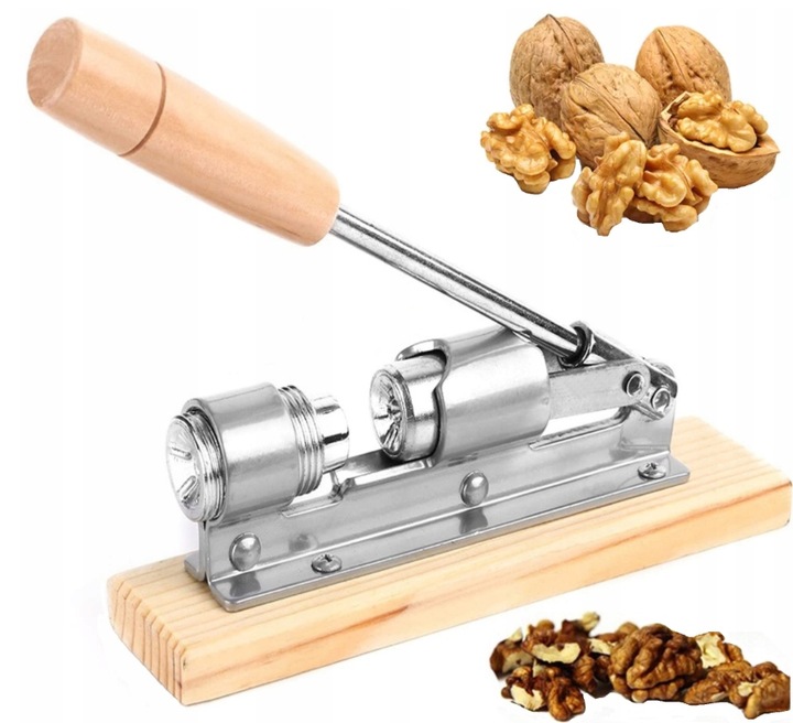 Щелкунчик из нержавеющей стали, прикрепленный к деревянной основе. Уникальная конструкция позволяет захватить орех. Обеспечивает большую прочность и получение более чистых, больших кусочков плоти
