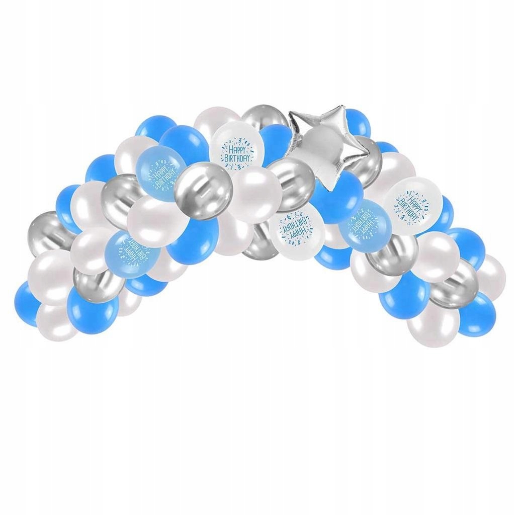 Набор украшений на день рождения состоит из 53 элементов. Это полная договоренность о день рождения для мальчика или поклонников синей связи с Серебром. В наборе: - 34 латексных воздушных шаров в синем (x17) и белом (x17), 25 см в размере - 6 латексных воздушных шаров с печатью с надписью с днем рождения, синим (x3) и белым (x3) с размером 25 см - 10 латексных воздушных шаров с серебряным хромом. Размер воздушных шаров составляет 30 см, - пластиковый баллон с серебряной формой, размеры 45 см, - топ для торта на день рождения с надписью с надписью с днем рождения, подчеркивая природу обстоятельств. Серебряный топпер с размерами 13x14 см, - лента для баллонной гирлянды длиной 5 м