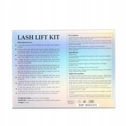 Этот набор предназначен для легкого и эффективности, содержит четкие рекомендации по использованию. Каждый шаг в руководстве четко описан, что обеспечивает тщательную производительность подъема и процедуры ламинирования ресниц без сложных специализированных знаний.