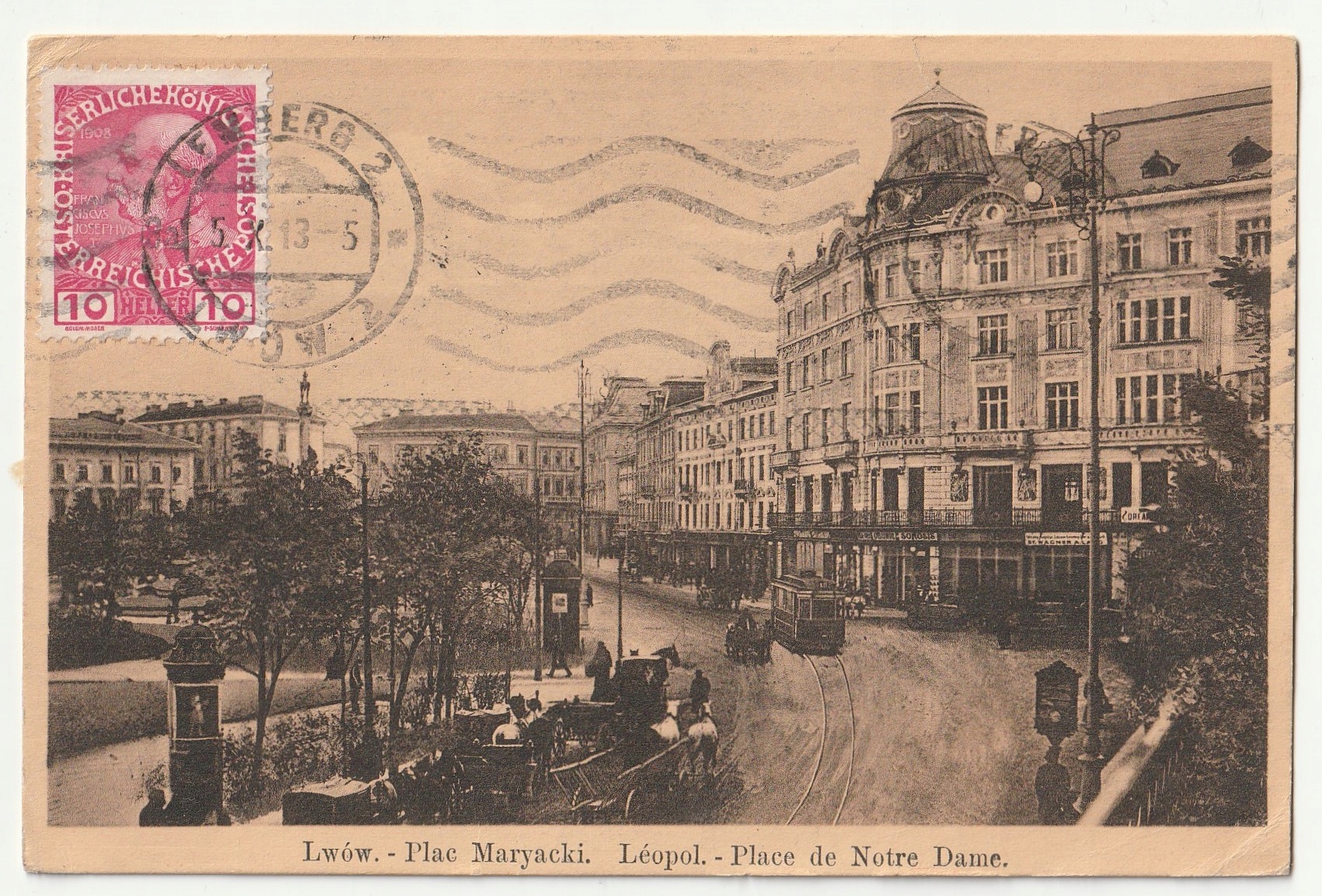 Львов - площадь Маряцкого. Леополь. Площадь Нотр-Дам. Марка с датой 5 октября 1913 года. Небольшой подгиб краев. Выведен из обращения.