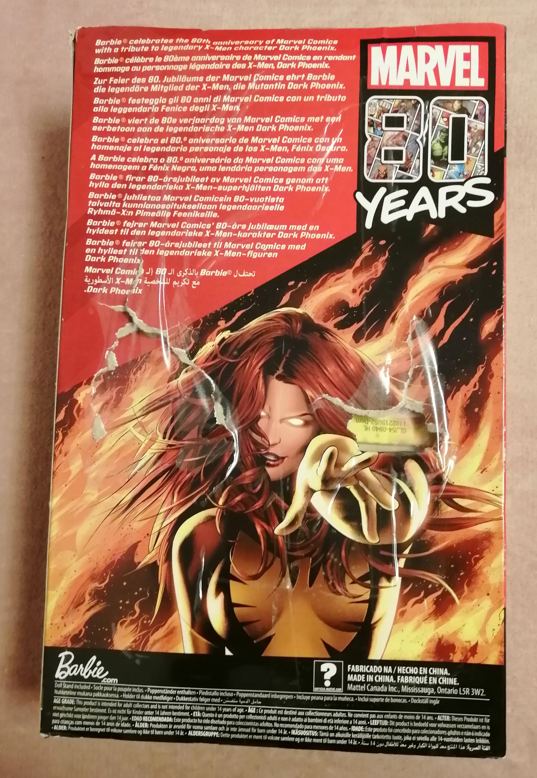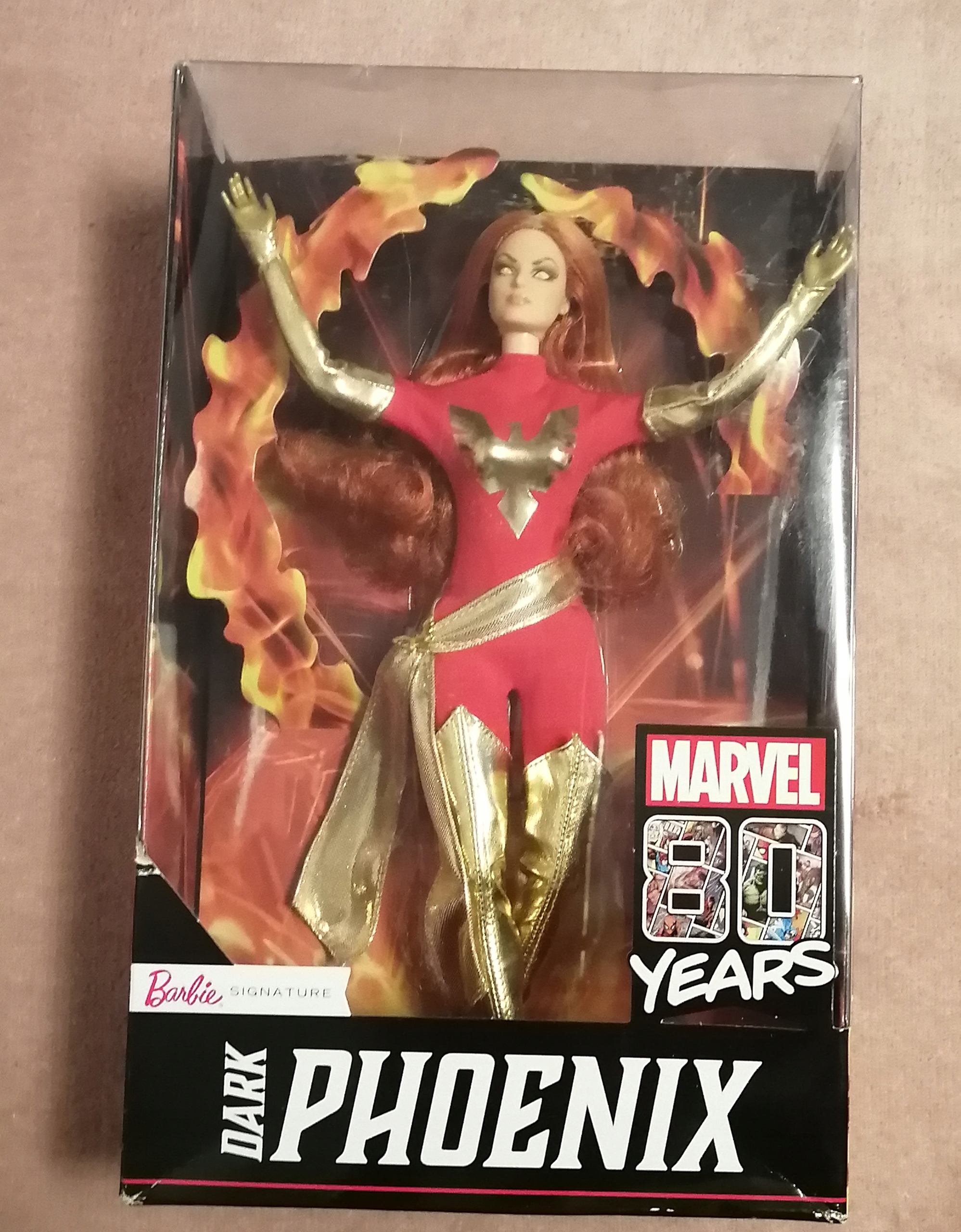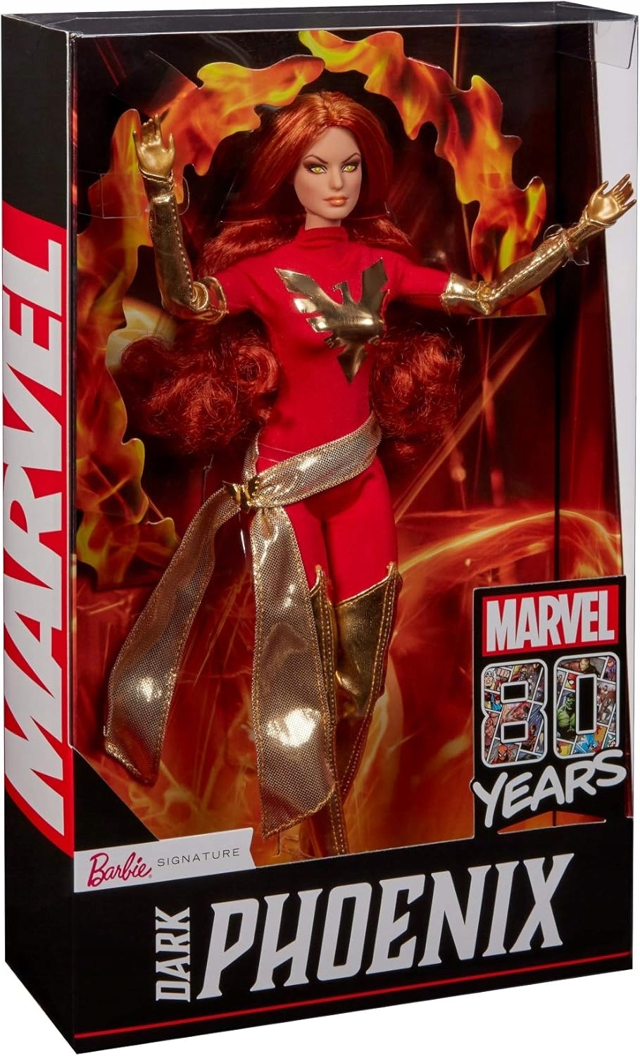 - Барби празднует 80-ю годовщину создания комиксов Marvel, отдавая дань уважения легендарному персонажу X-Men, Dark Phoenix. , в красном теле с красным телом с культовой графикой Феникса. Блестящие детали включают в себя металлический золотой пояс, перчатки и обувь для бедер. Имеет живые, желтые глаза и длинные рыжие волосы
