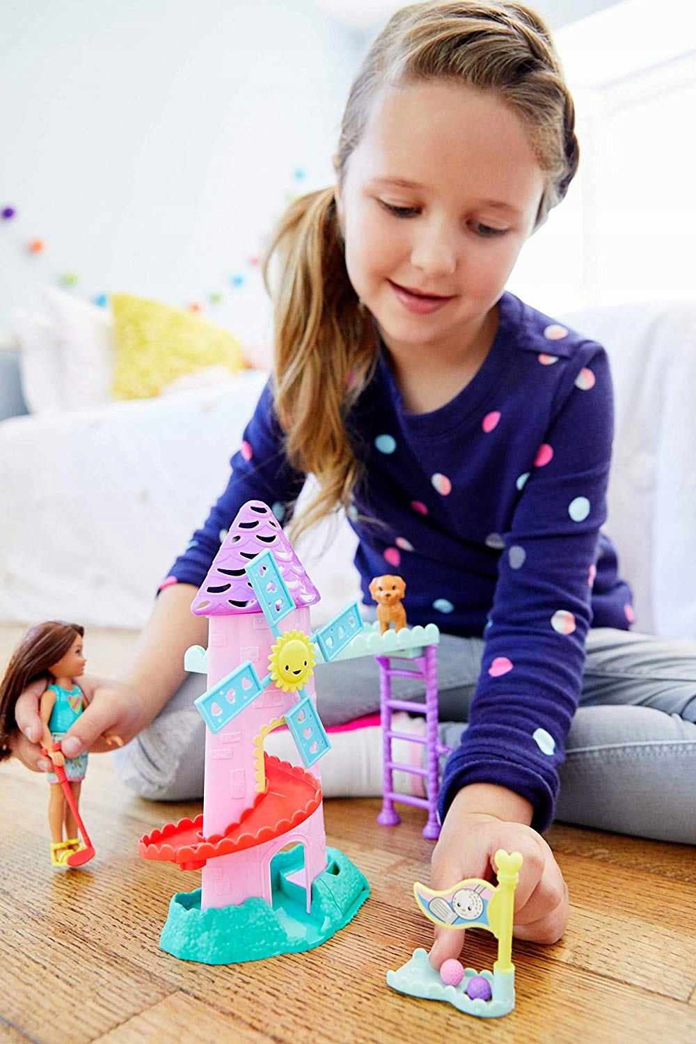 Клуб «Челси» — это фантастическая группа друзей и знакомых, основанная младшей сестрой Барби. Дети любят вместе играть, кататься на аттракционах или организовывать спортивные соревнования. Шестилетняя Челси – чрезвычайно энергичная девочка с головой, полной сумасшедших идей. На этот раз он приглашает вас сыграть в мини-гольф! Вы присоединитесь? Но сначала вам придется построить поле для гольфа, полное аксессуаров и гаджетов. Главным элементом станет фиолетовая вертушка с вращающимися пропеллерами. Комбинируйте его с красной горкой и ковриком с отверстием для шарика. Затем возьмите в руку клюшку для гольфа и посмотрите, какое расстояние пройдет мяч, прежде чем попадет в лунку. Набор предлагает массу возможностей для творческой игры.
