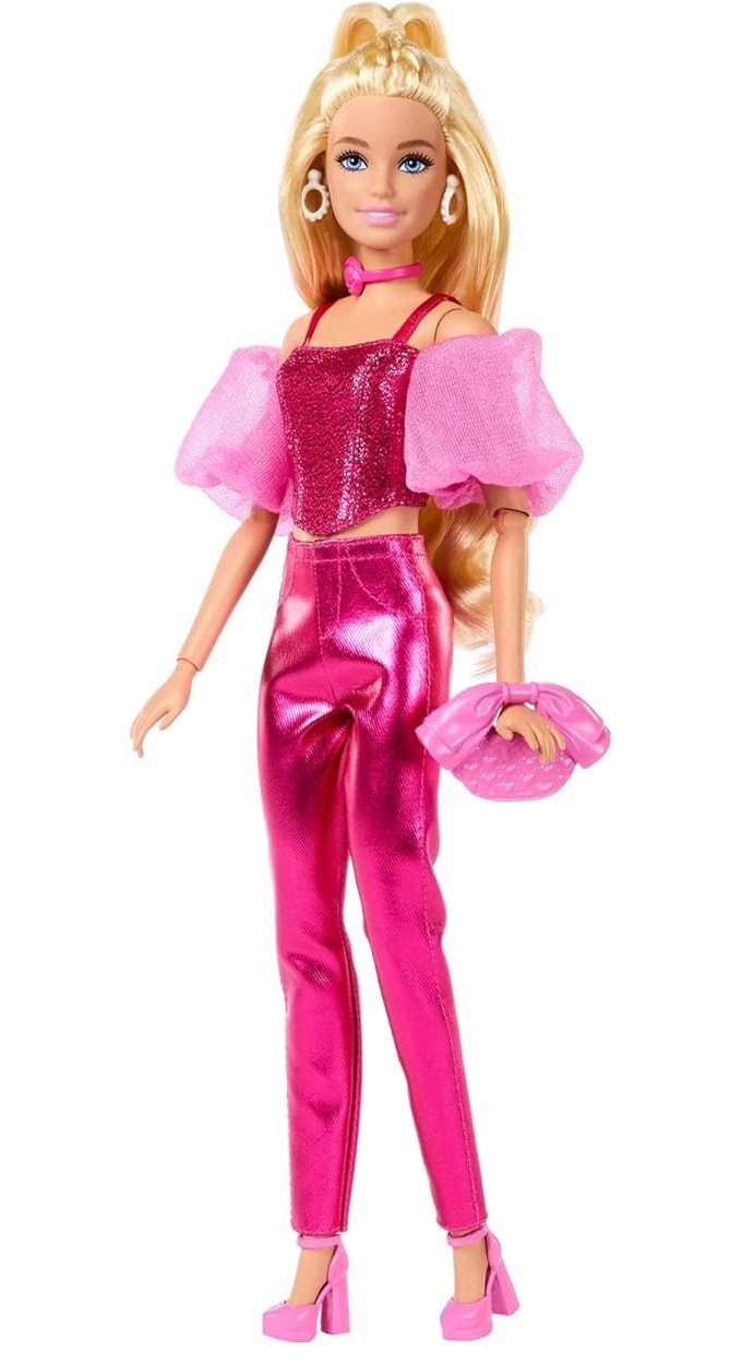 Эта кукла Барби ослепляет розовым от головы до головы! Ее блестящий металлический корсет контрастирует с воздушными рукавами из органзы.