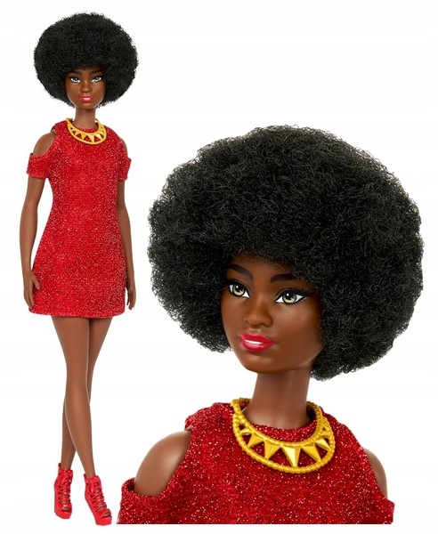 Кукла Barbie Fashionistas, вдохновленная своим семейным нарядом 1980-х годов, носит красное вязаное платье с вырезом.