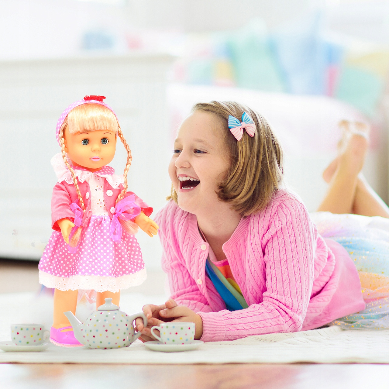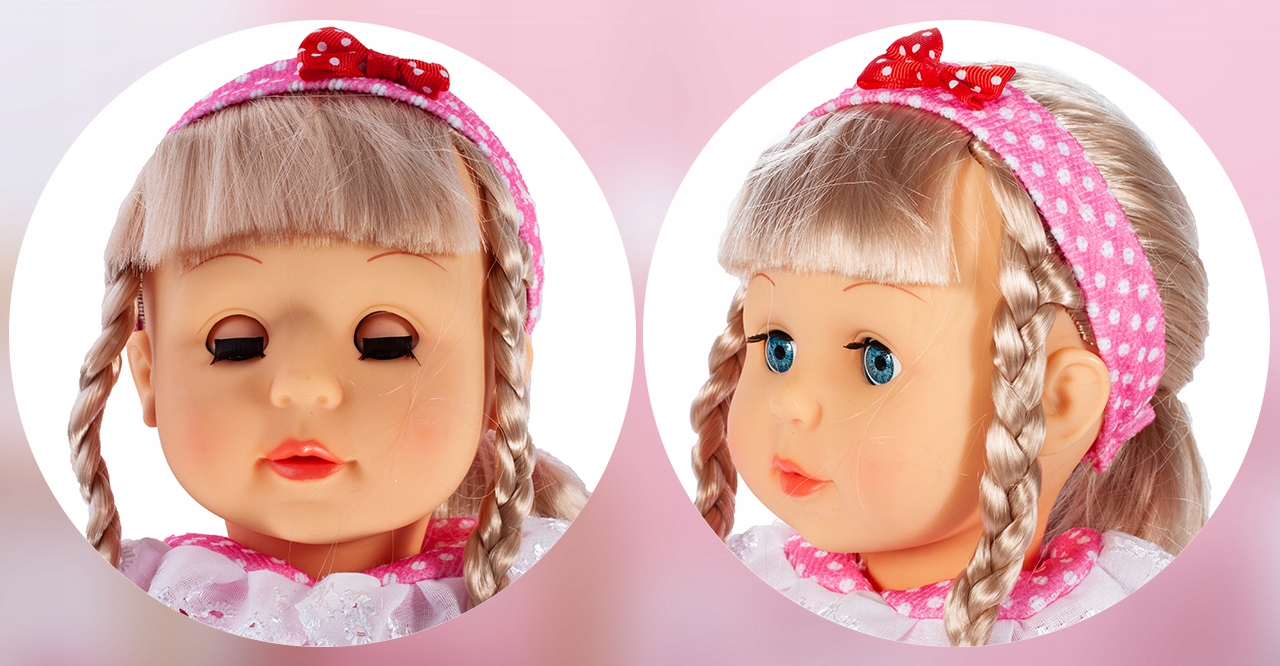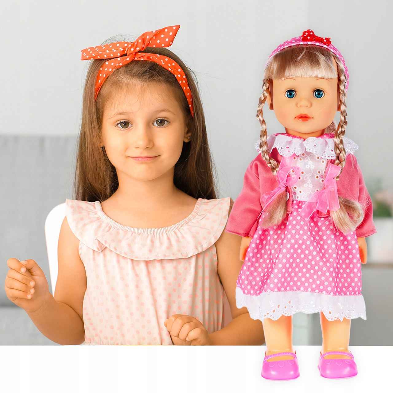 На кукле розовое платье с бантиками и розовые туфли. Включение куклы осуществляется с помощью выключателя на спинке. Он разговаривает и поет песни во время ходьбы. Ее длинные красивые светлые волосы идеально подходят для расчесывания и укладки. Поролоновая подкладка под обувь.