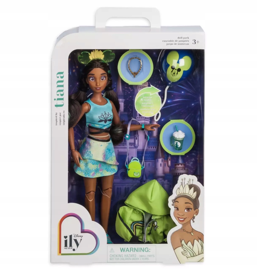 В воздухе витает волшебство, и все может быть произойдет, если их воображение захватит куклу Disney Ily 4EVER, вдохновленную Тианой. Ее стильный наряд и аксессуары вдохновлены диснеевским мультфильмом «Принцесса и лягушка» — от блестящих зеленых бликов в ее длинных волосах до повязки на голову с ушками Минни Маус и стильного наряда с фирменным мотивом Тианы в виде кувшинок. Воздушный шар в форме Микки Мауса содержит сюрприз, которым будет гордиться шеф-повар Тиана. Это одна из 12 закусок в парке, но они не узнают, какая у них, пока не откроют ее.