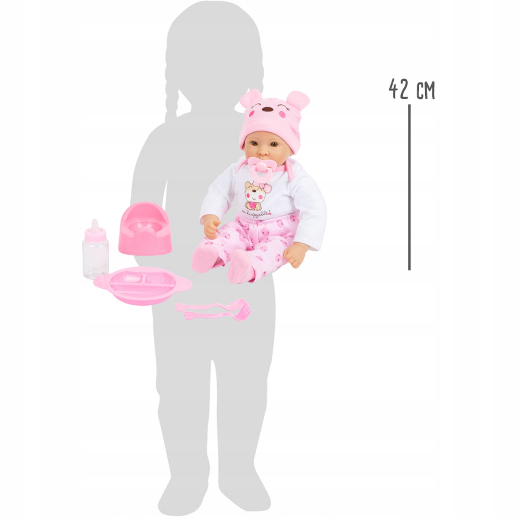 На кукле одеты розовые шорты с рисунком, блузка и туфли, а также розовая шапочка с забавными ушками. Все предметы одежды легко снимаются и надеваются. В комплект также входят горшок, соска, бутылочка, тарелка с ложкой и вилкой.