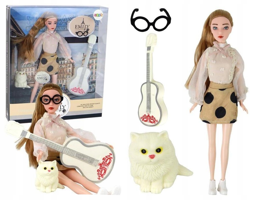 Кукла Эмили для детей с гитарой, очками, длинными светлыми волосами, котенкомПредставляем куклу Эмили с гитарой и очаровательным другом - белым котенком, который при нажатии издает пищащие звуки. Изделие позволяет ребенку развивать воображение, играя с продуктами, входящими в набор. Он позволяет научиться творческому уходу за животным и создать историю двух друзей на свежем воздухе. Эмили — очаровательная игрушка с длинными светлыми волосами, собранными в хвост. У нее зеленые глаза и элегантный стиль: белая рубашка с розовым бантом, коричневая юбка в черный горошек и белые спортивные туфли. В комплект также входят черные очки и белая гитара с розовым декором. Размеры гитары 17 см х 6 см. Эмили является идеальным компаньоном для маленьких любителей музыки. Она стимулирует творчество, развивает социальные навыки и доставляет бесконечное удовольствие и удовольствие. Этот уникальный набор может стать отличным подарком для маленьких любителей. В набор входит: Кукла Эмили в очках, гитара, кот, Размеры куклы: 30 см х 7 см х 4 см, Размеры котенка: 5 см х 4 см, Размеры упаковки: 32 см х 28 см х 6 см. Игрушка предназначена для детей старше 3 лет, сертифицирована CE и соответствует стандарту ENF1.