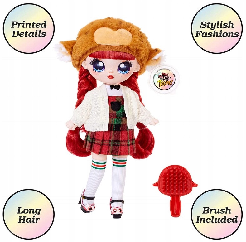 Нет! На! На! У Саманты Смарти из Surprise Teens длинные рыжие волосы, лицо с принтом и детали одежды. Ее любимое животное — сова. У нее пушистая шляпа в виде совы, клетчатый наряд и милые туфли Мэри Джейн в виде совы. Саманта Смарти очень умна! У нее красивый школьный стиль: клетчатое платье и свитер. Принты представляют собой белые носки по колено с красными и зелеными полосками сверху. У нее также есть тег с такой информацией, как ее имя, дата рождения и девиз.