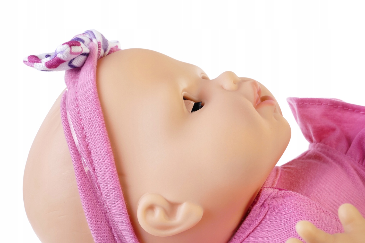 Кукла выглядит как настоящий ребенок. Она одета в красивые, яркие шорты и розовую блузку, а на голове повязка.