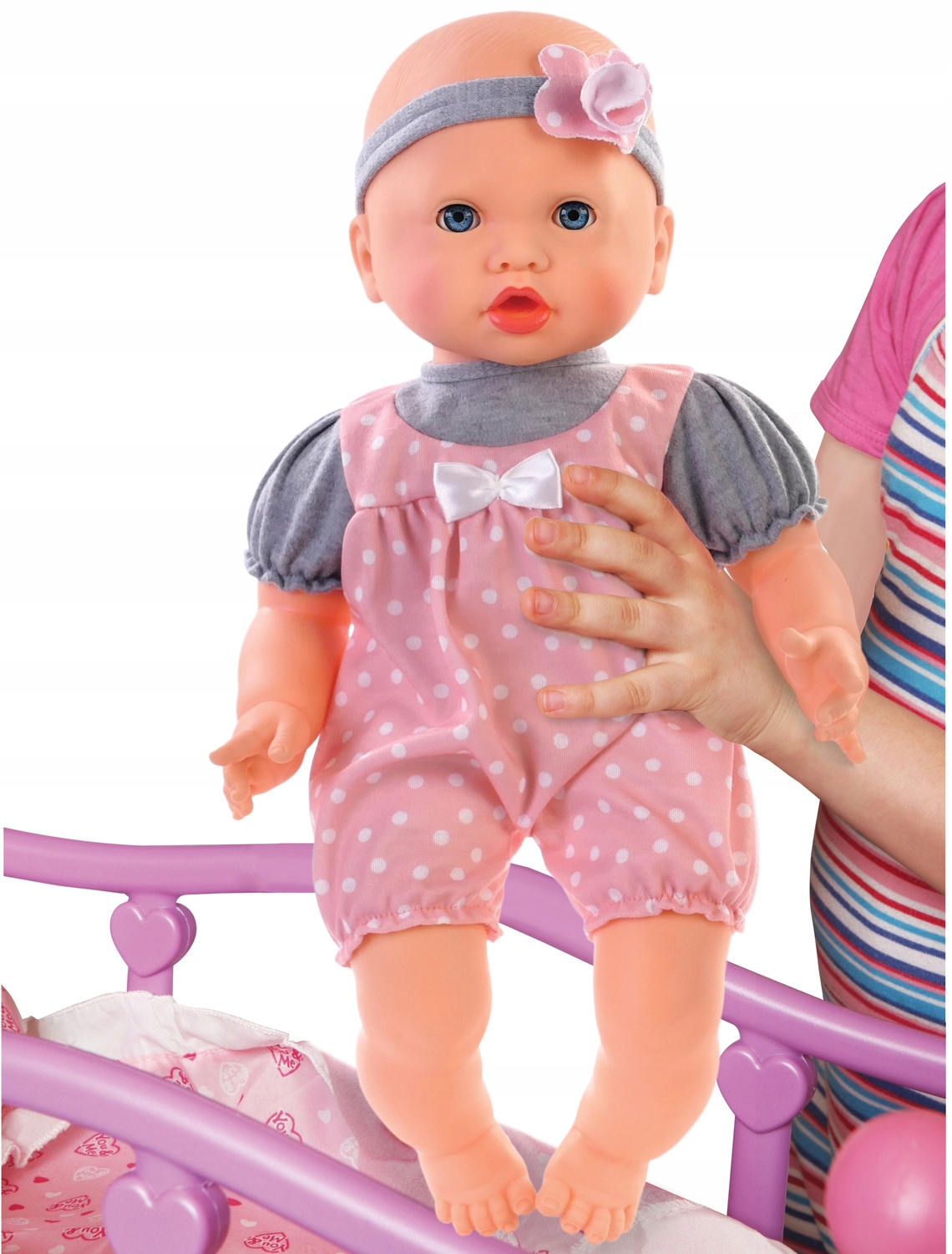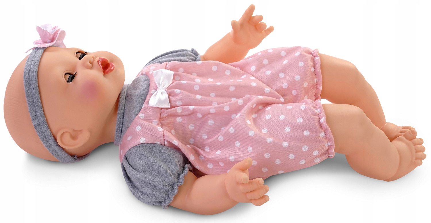 Малыш одет в красивые, аккуратно сшитые серо-розовые комбинезоны в белый горошек. На голове у нее серая повязка с розовым цветком. Очаровательное личико куклы вызовет у ребенка желание играть с любимой игрушкой